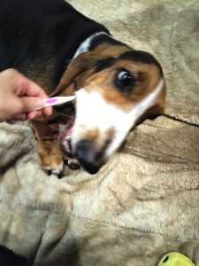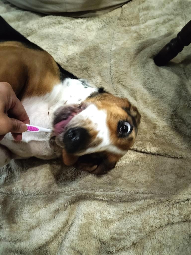 ご飯後の歯磨きタイムです 犬も歯周病になり放置すると骨に穴が開いて大手術になりかなり痛い目にあいます 前の犬も手術で歯を何本も抜き、術後の傷みでヒンヒン泣いていて可哀そうで猛省した事がありました