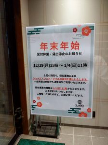 サイボディ富士吉田店に「年末年始の受付休業・貸出停止のお知らせ」が掲示されています。