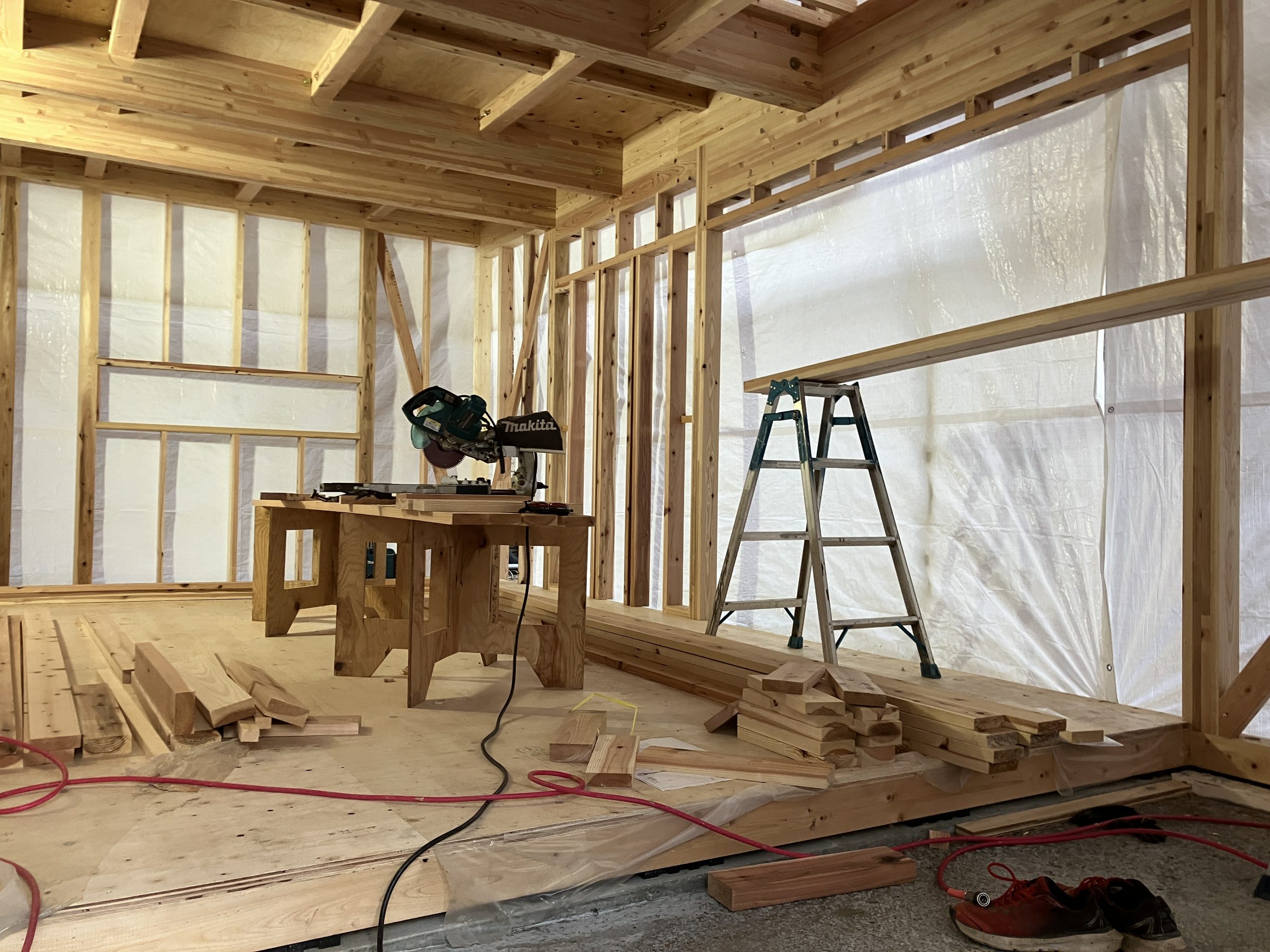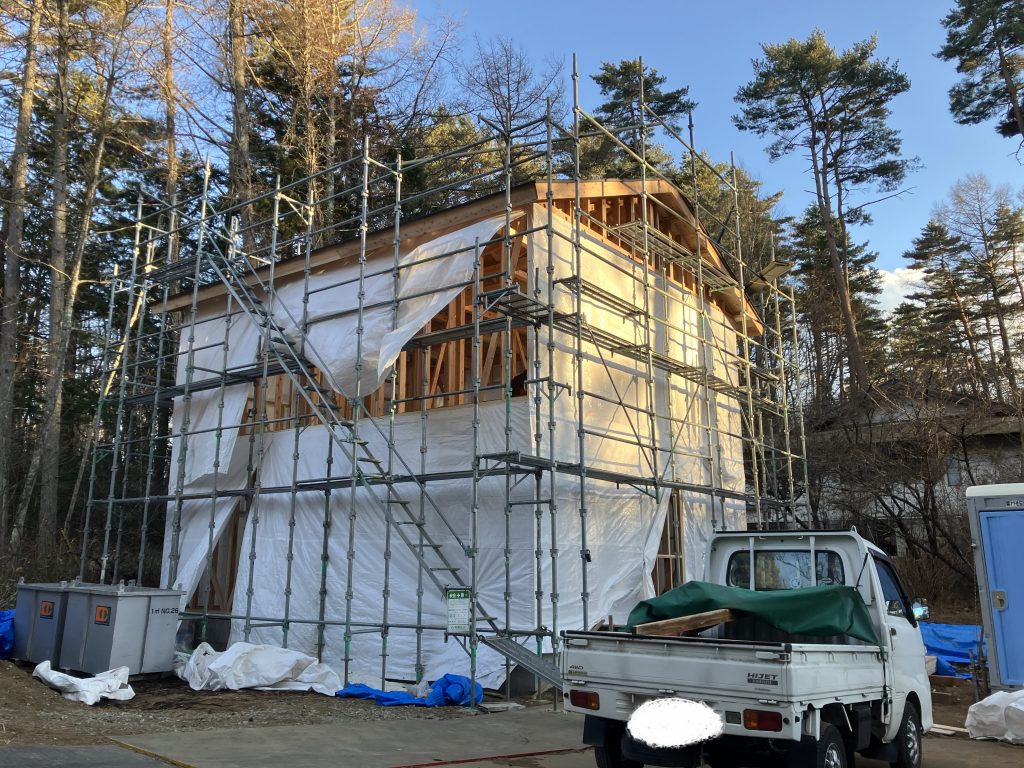 U様邸、大工工事中です この日は強風が吹き、あちこちの養生シートが飛んでしまい大変でした