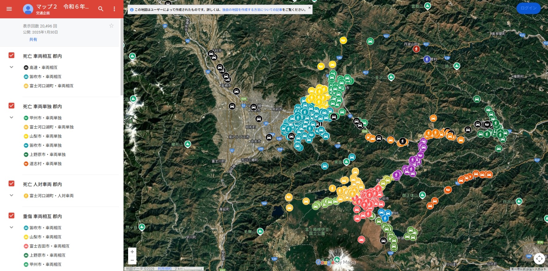 山梨県警本部のホームページにて県内の交通事故発生マップが公開されています。