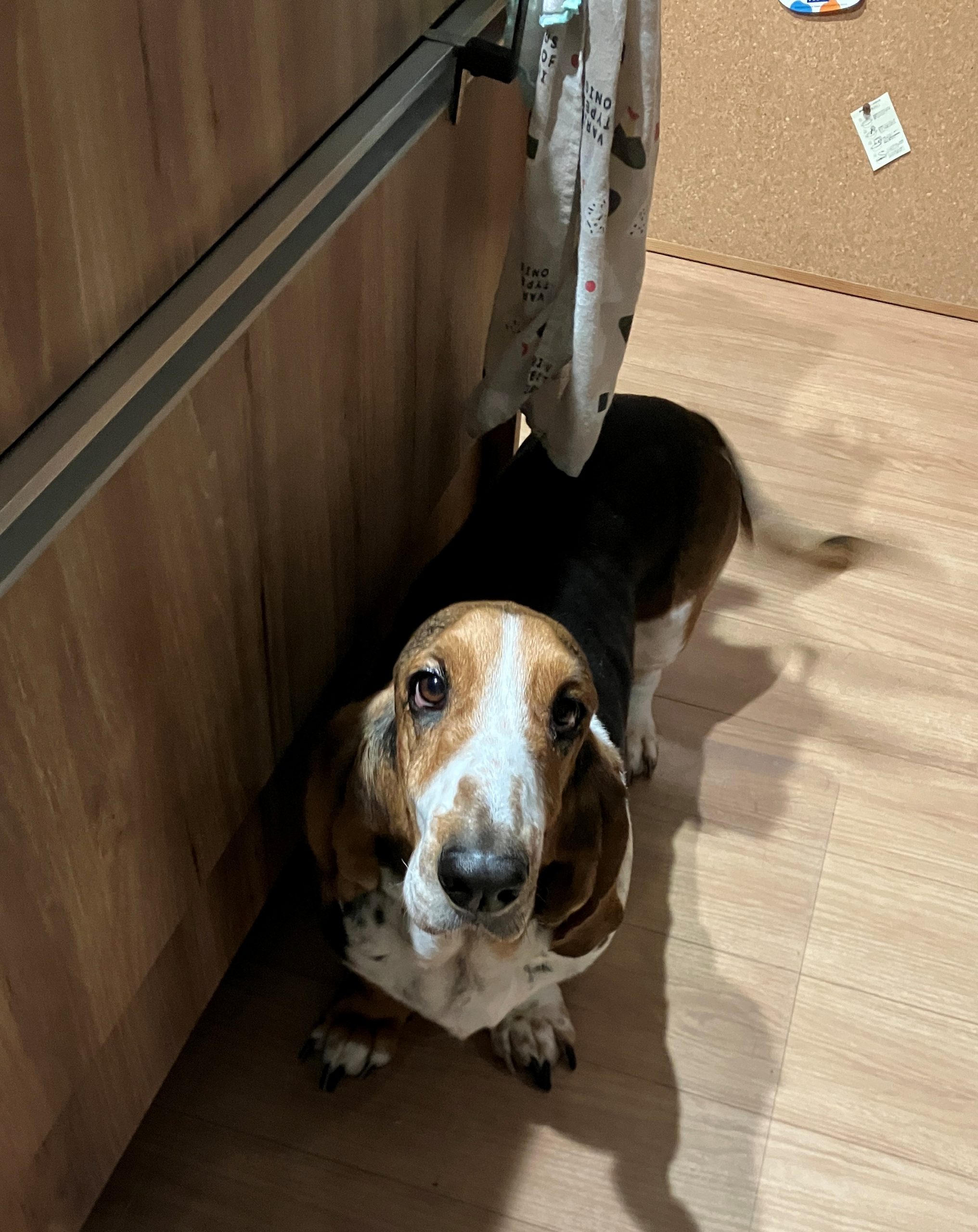 家のワンコさん 足が短いので座った背丈は膝丈程度ですが、立ち上がると腰ぐらいの高さがあります