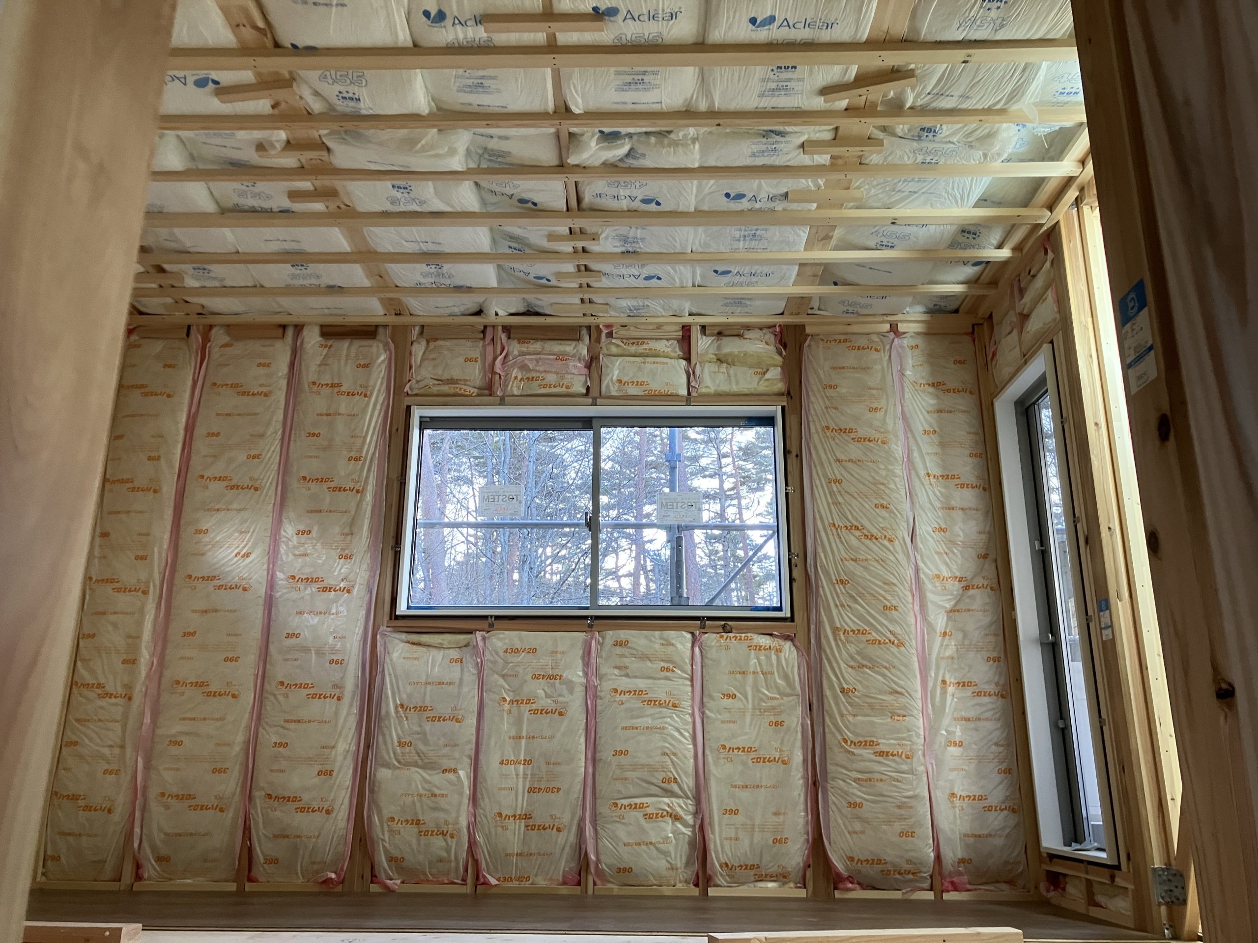 しっかりとグラスウールが張られています これだけで外との気温差が凄いです^^ ストーブ1台で中はポカポカ、作業中は上着いらずで安心です この後ボードを張るので今だけの景色です