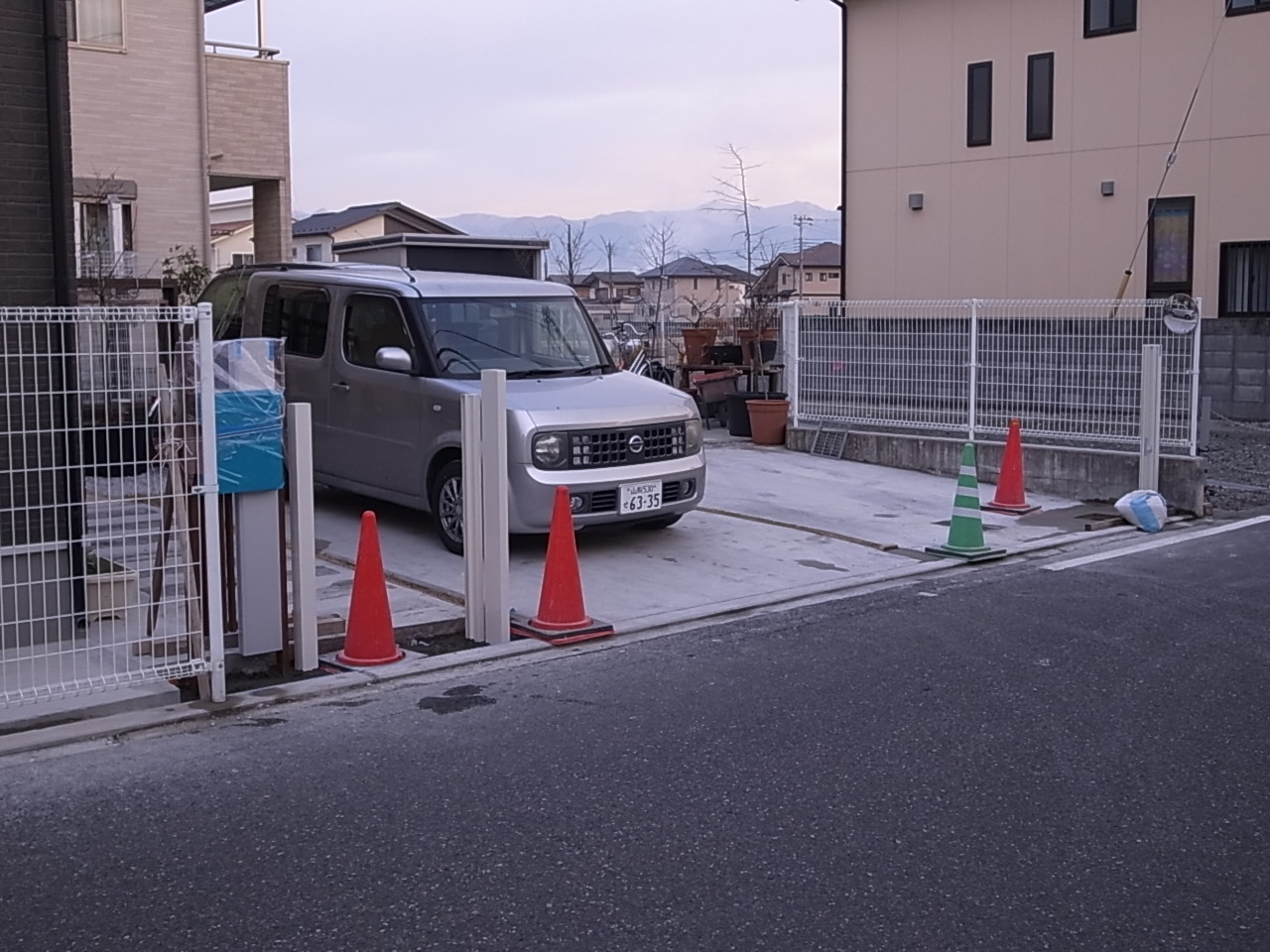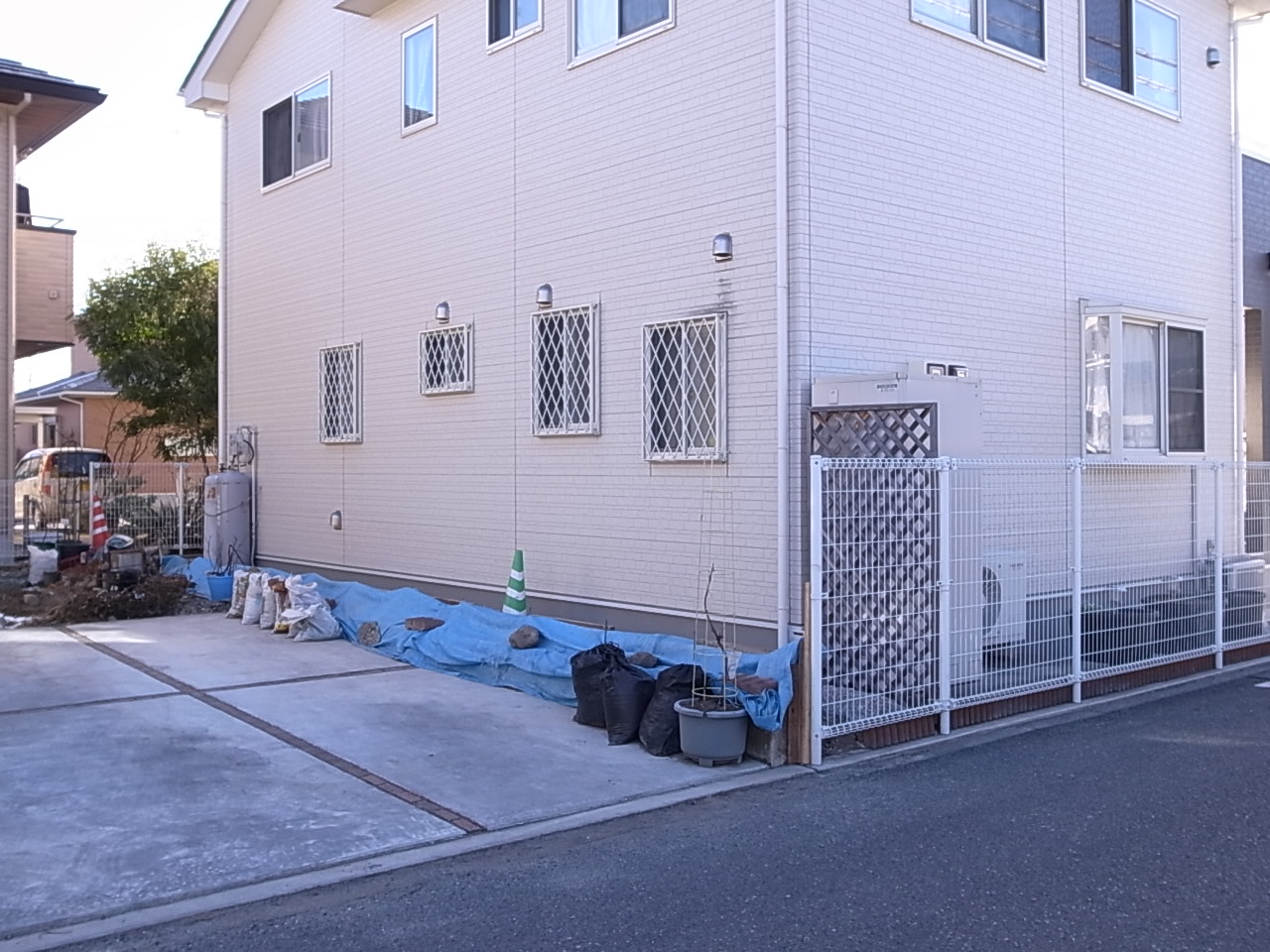 こんにちは! 本日、完了したA様邸外構工事です 西面道路側に玄関門扉と駐車場に伸縮門扉、北側隣地境界に 化粧ブロック積みフェンス工事を年越しで行いました 工事中の状況です。冷える時期なので、養生に注意を払いました。 ホワイトを基調とした機能的な外構です