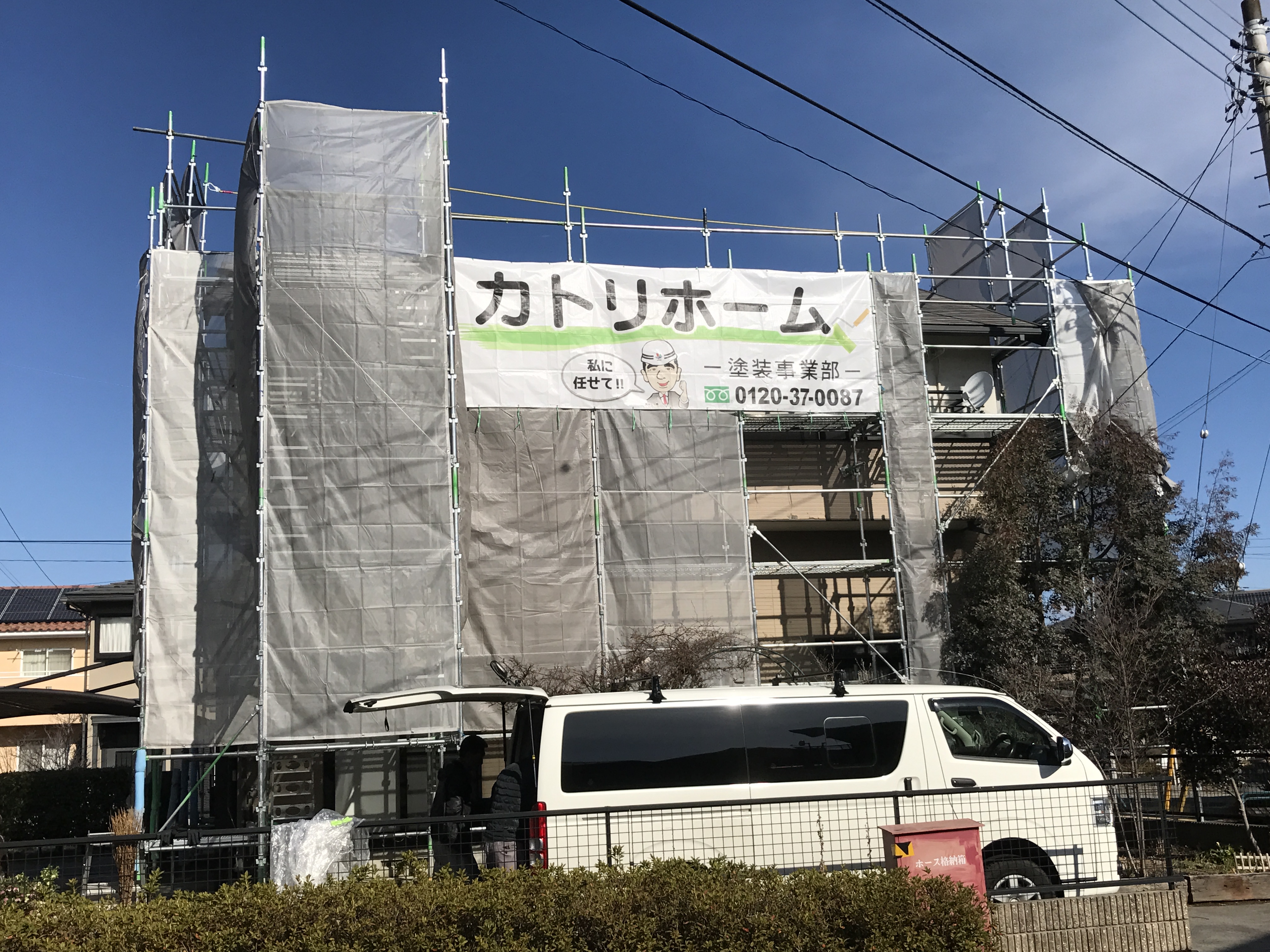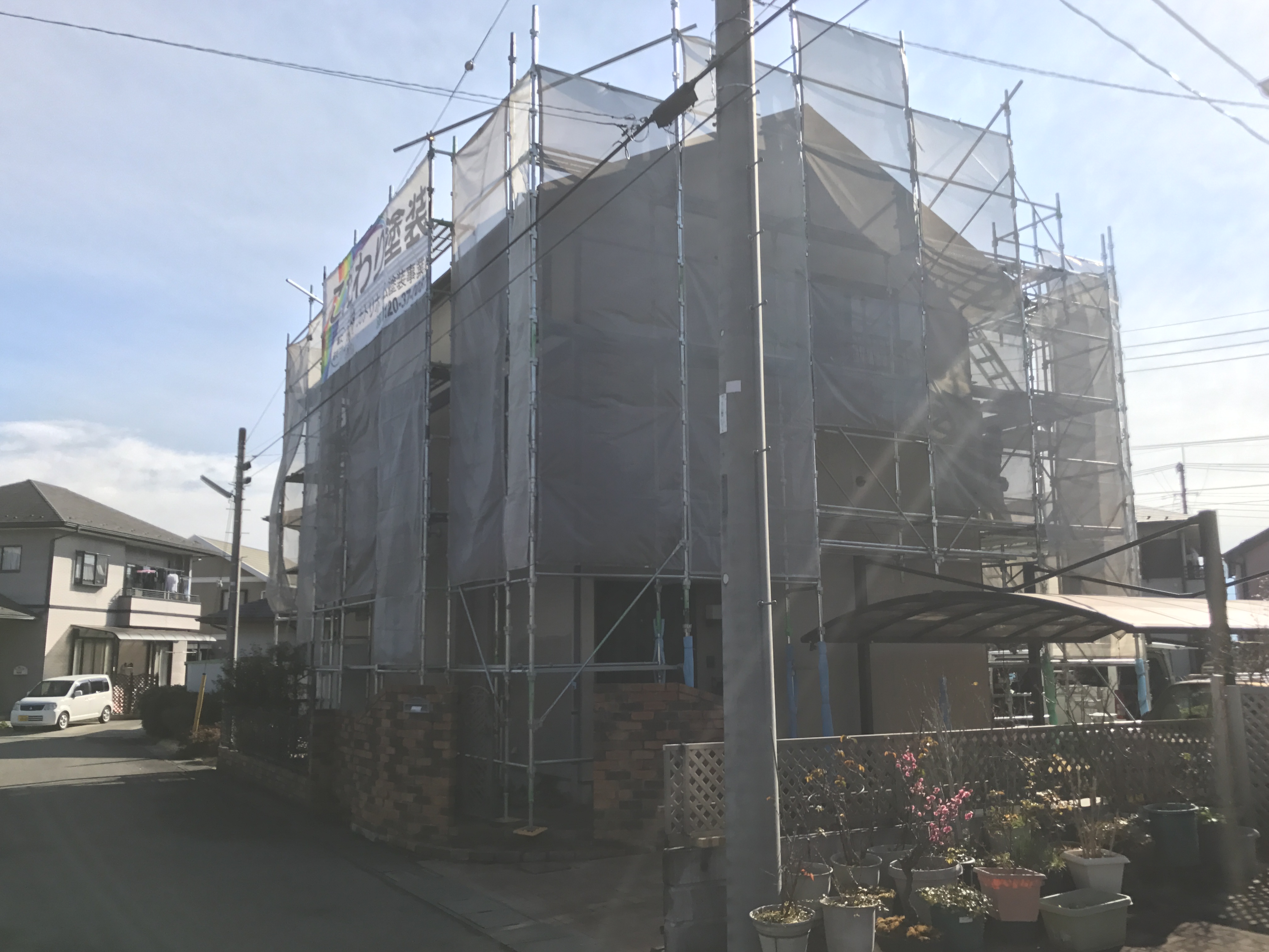 足場をかけ着工しました。洗浄、外壁の一部張替え、コーキング工事、屋根外壁塗装工事の順に
