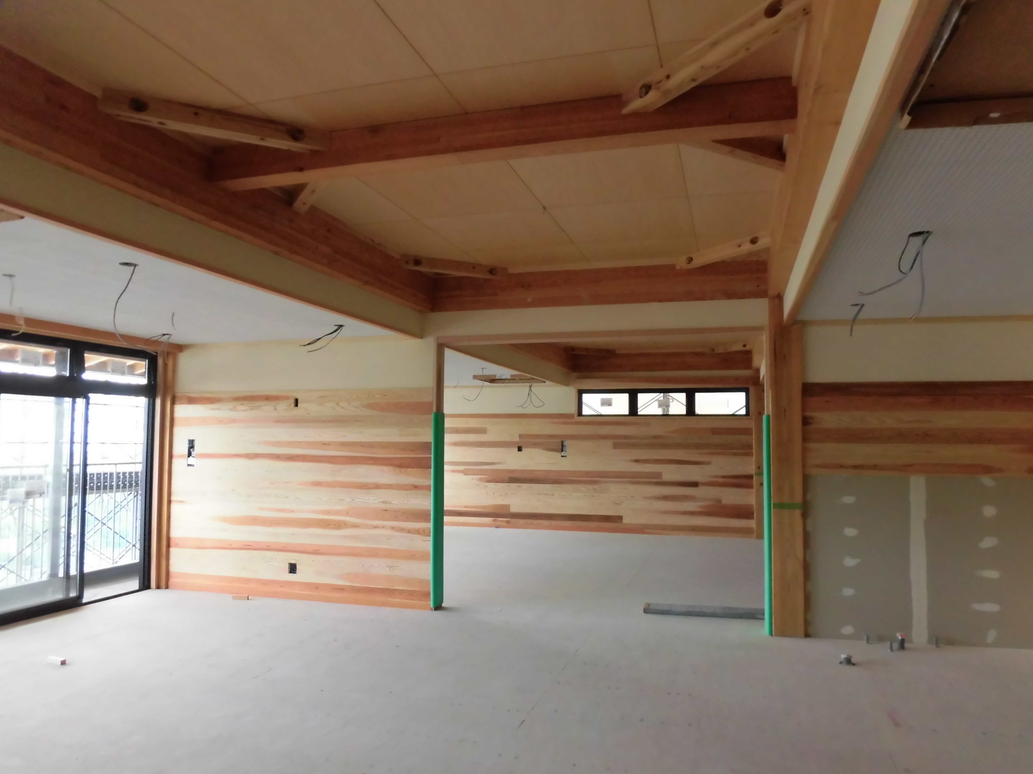 遊戯室棟全景です。 外部足場を取り外しました。 これから外構工事に移りたいのですが、 保育室棟の外部足場がある為もう少し待ちです。 保育室棟も2階は仕上げ工事が進んでいます。 2F保育室内部の様子です。