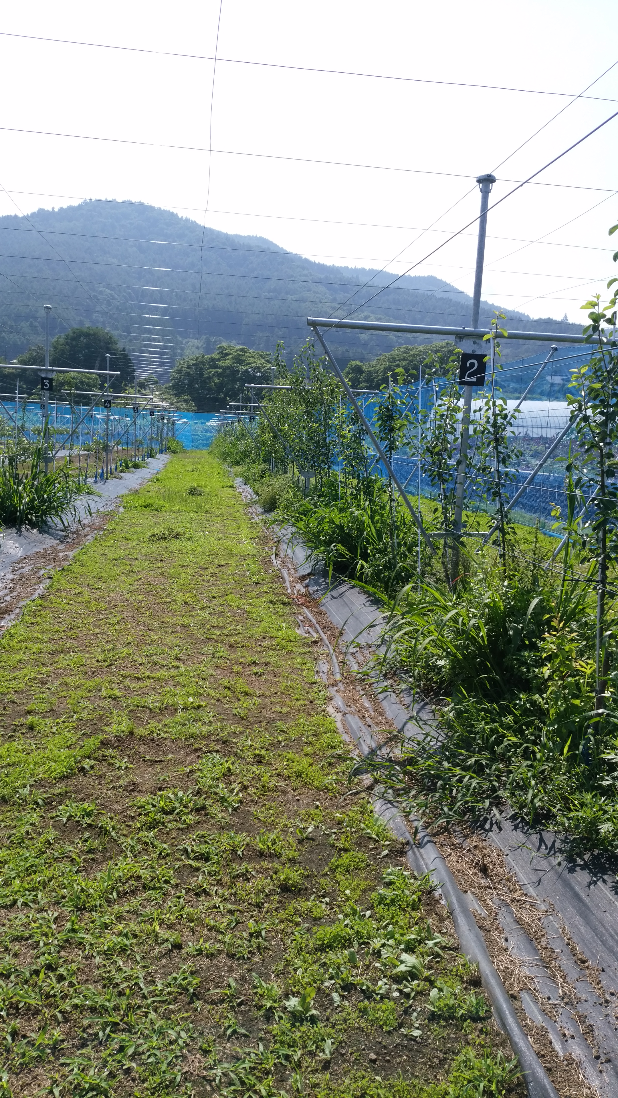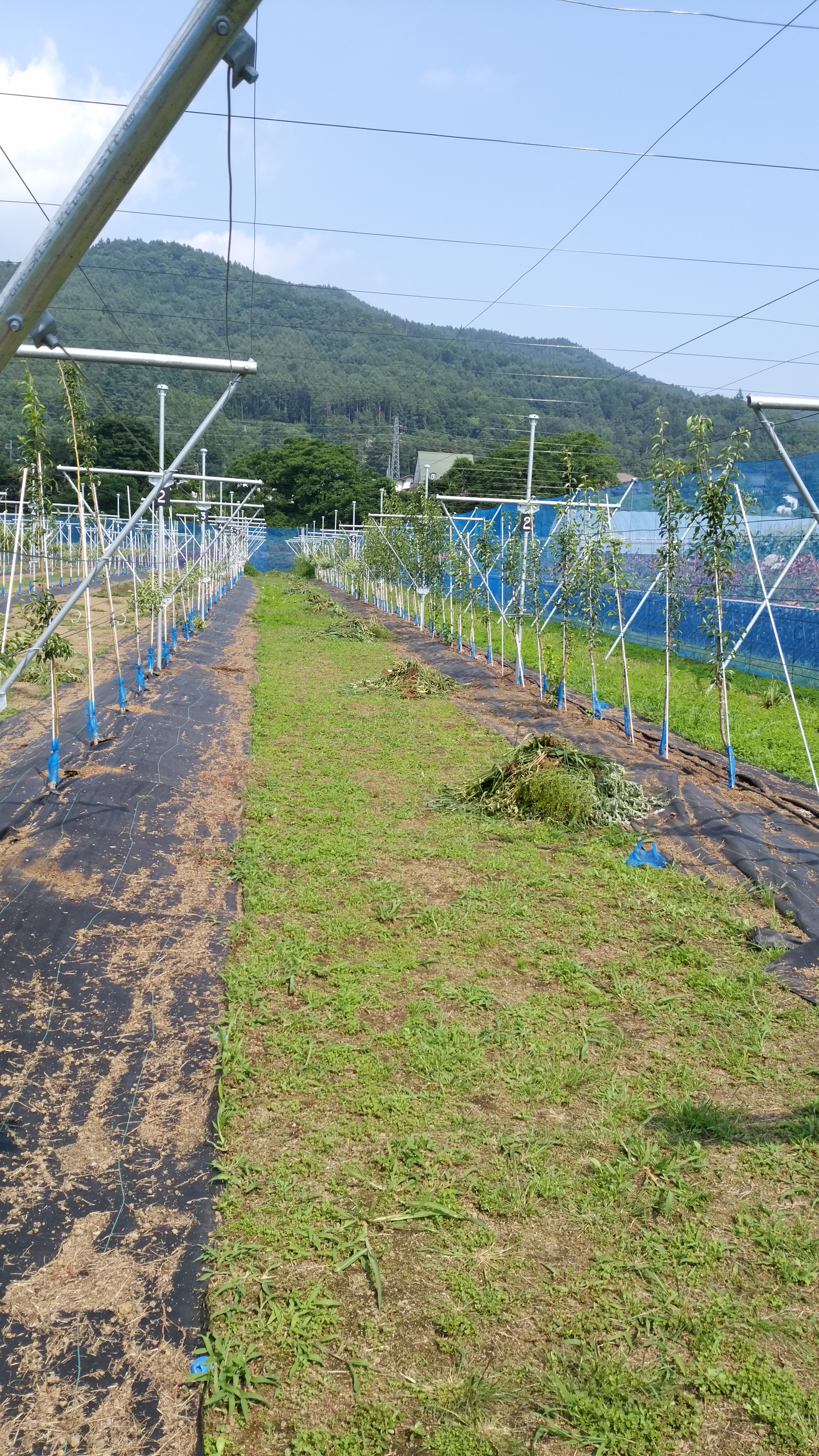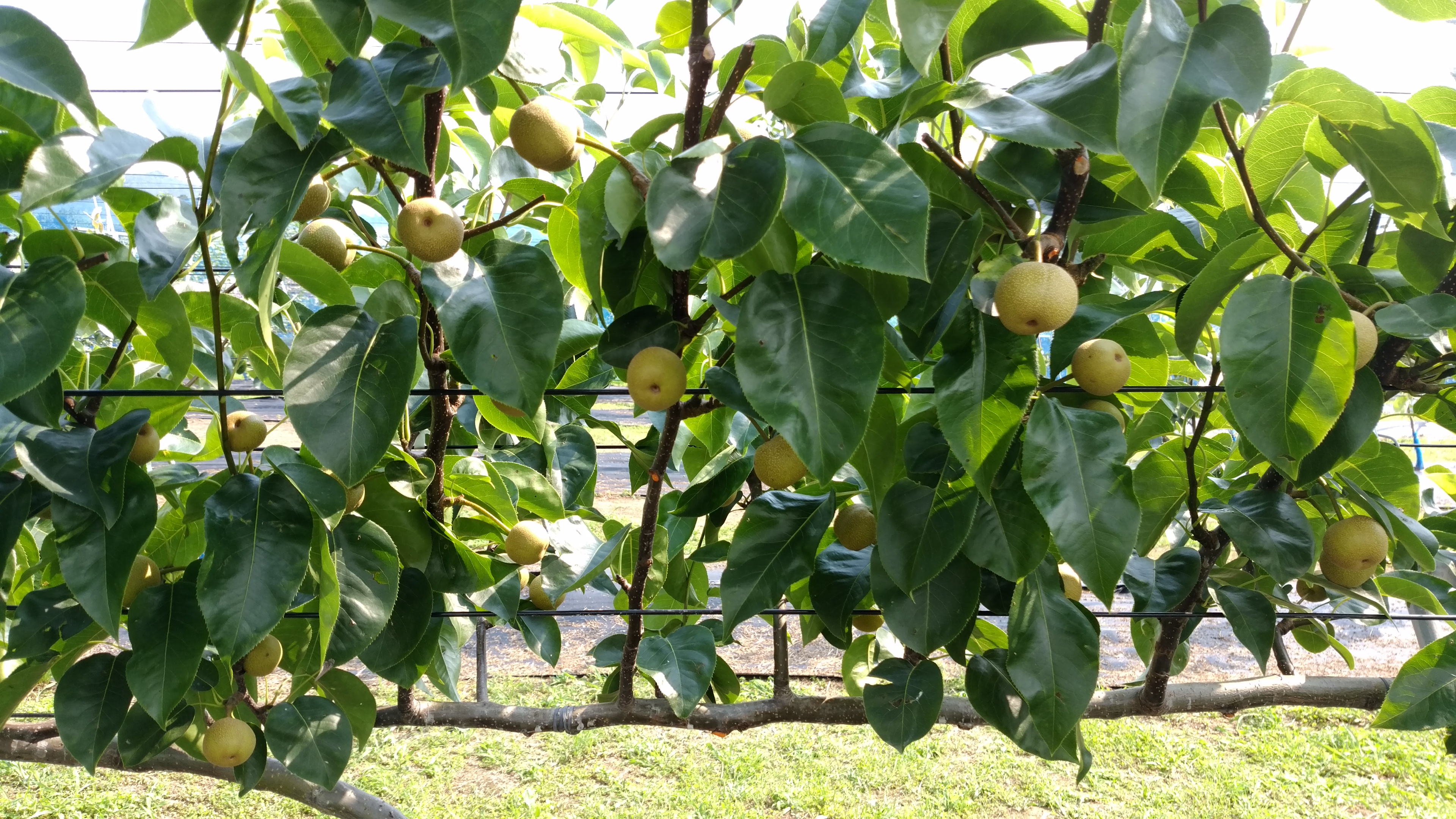 先日また、畑の草取りを手伝いました。 2週間前とは違い、暑さも半端でなく草もひどい勢いで伸びて根も張り大変な状態でした。 前回は4列目まで進んだのですが今回は1列位しかできませんでした。 やはり、雑草は小さなうちにコツコツとらないと大変なことになりますね。 暑さも増し、熱中症になりかけました。 でも、梨の実はこんなになりました。