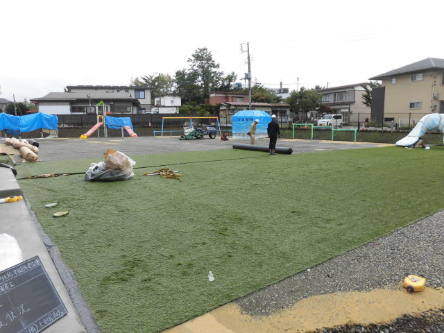 この工事は、本体工事でなく外構整備工事で上田屋商会さんの工事になります。雨が降っている間は作業ができないそうです。
