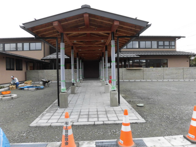 建築の工事では、入口の歩廊部分の床のコンクリート平板舗装工事を行い入口が様になってきました。