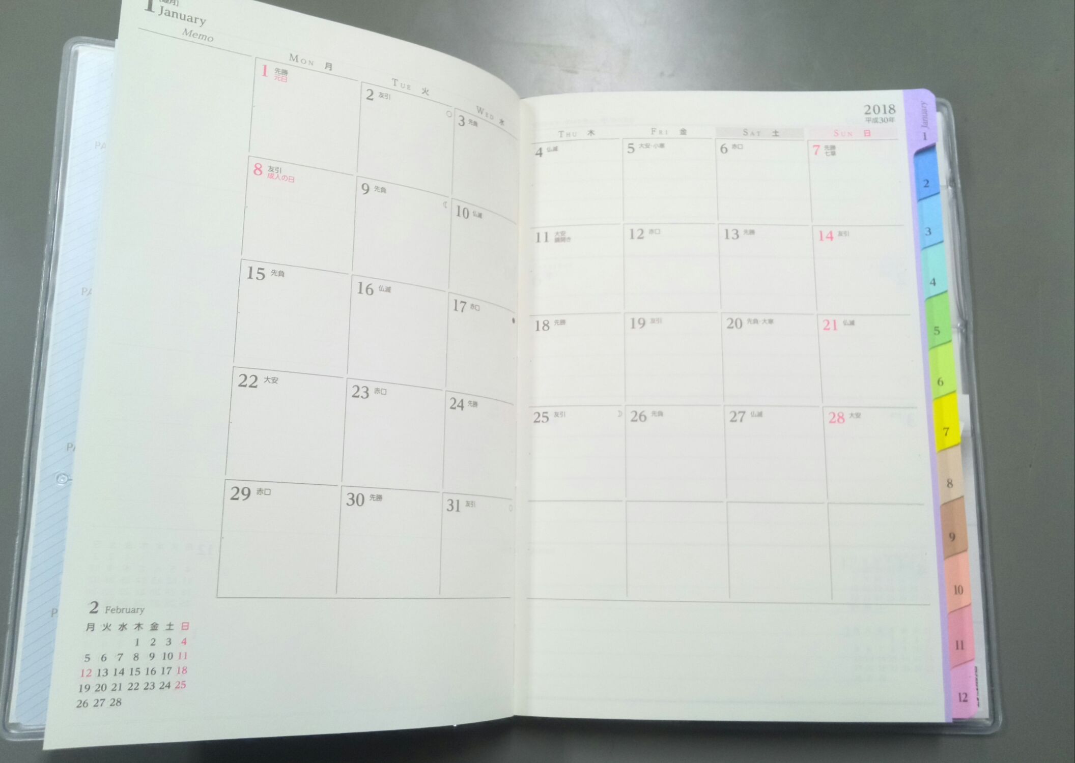 見開きの月ページのほか、週間メモという形で毎日の予定を書く欄も大きめにとってあり充実してます。