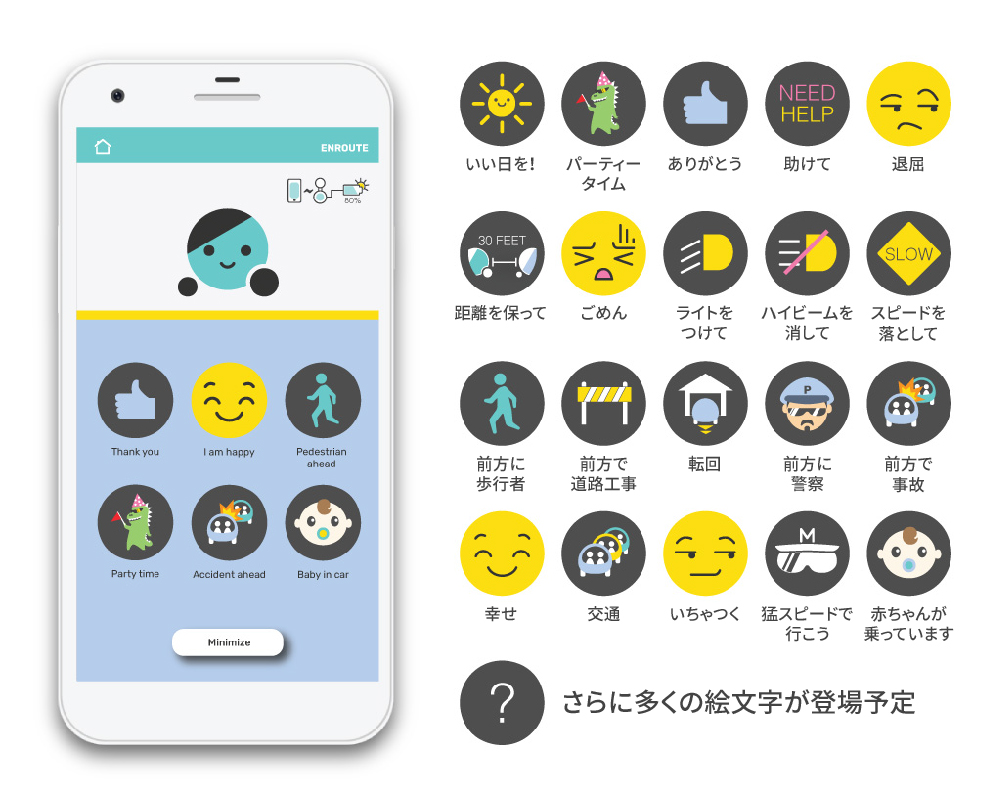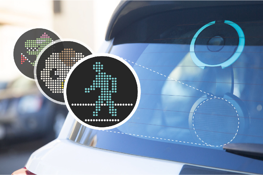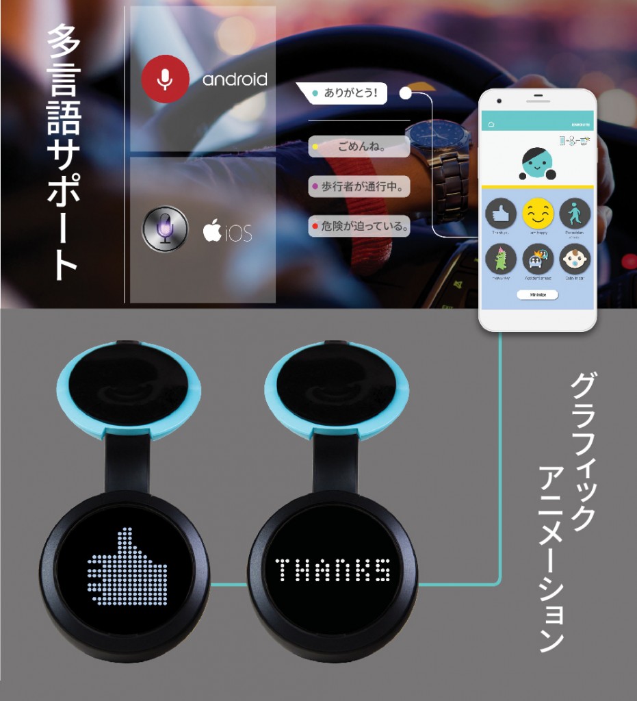 車の後部ガラスに貼り付けて後続車にグラフィックアニメーションで思いを伝えられるというもの。