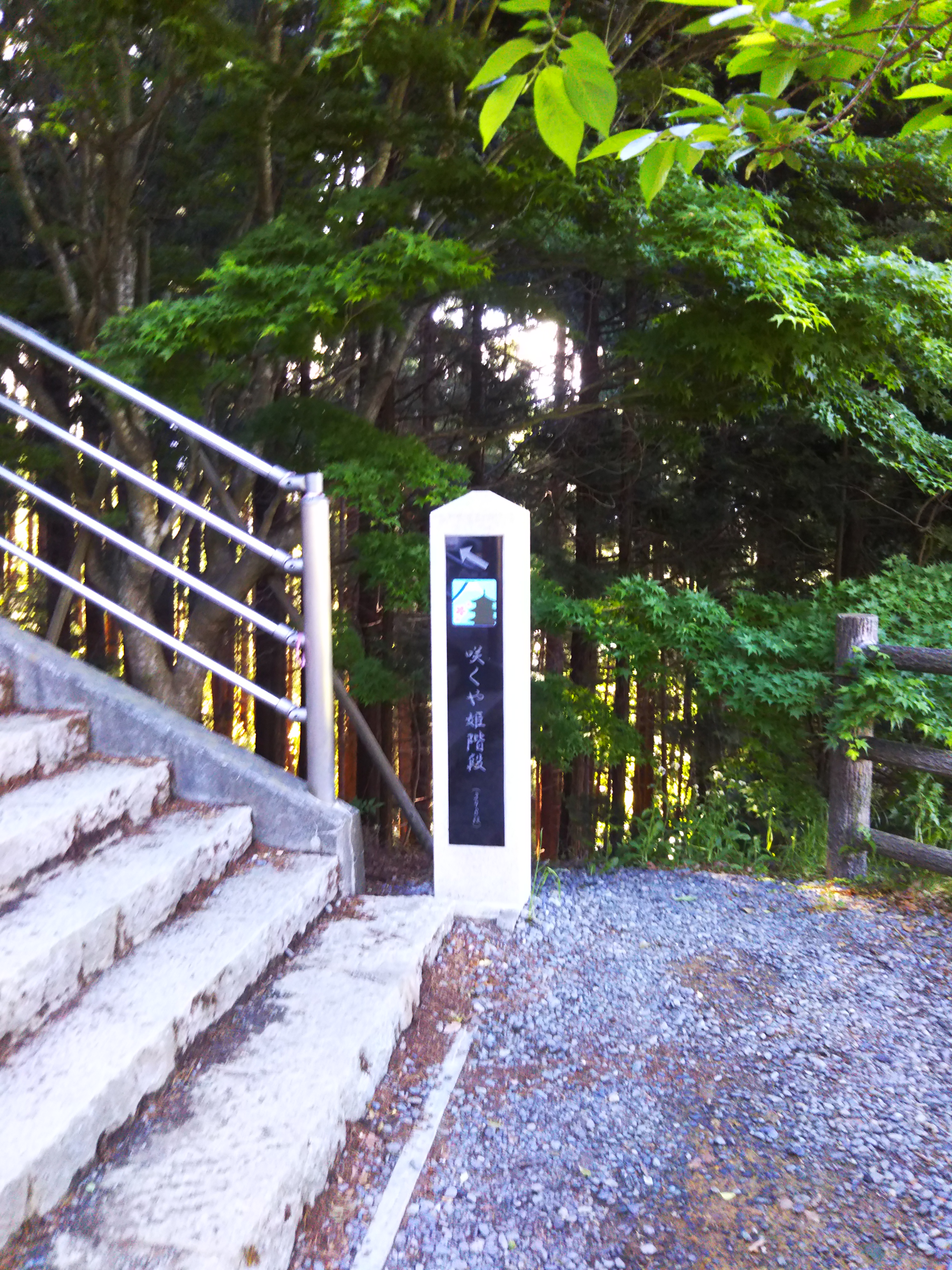 浅間神社を過ぎここからが、忠霊塔絵の階段が始まります。 さくや姫階段だそうです。 さ頑張ろう。 150段上がった踊り場で一息 ここからの富士山です。