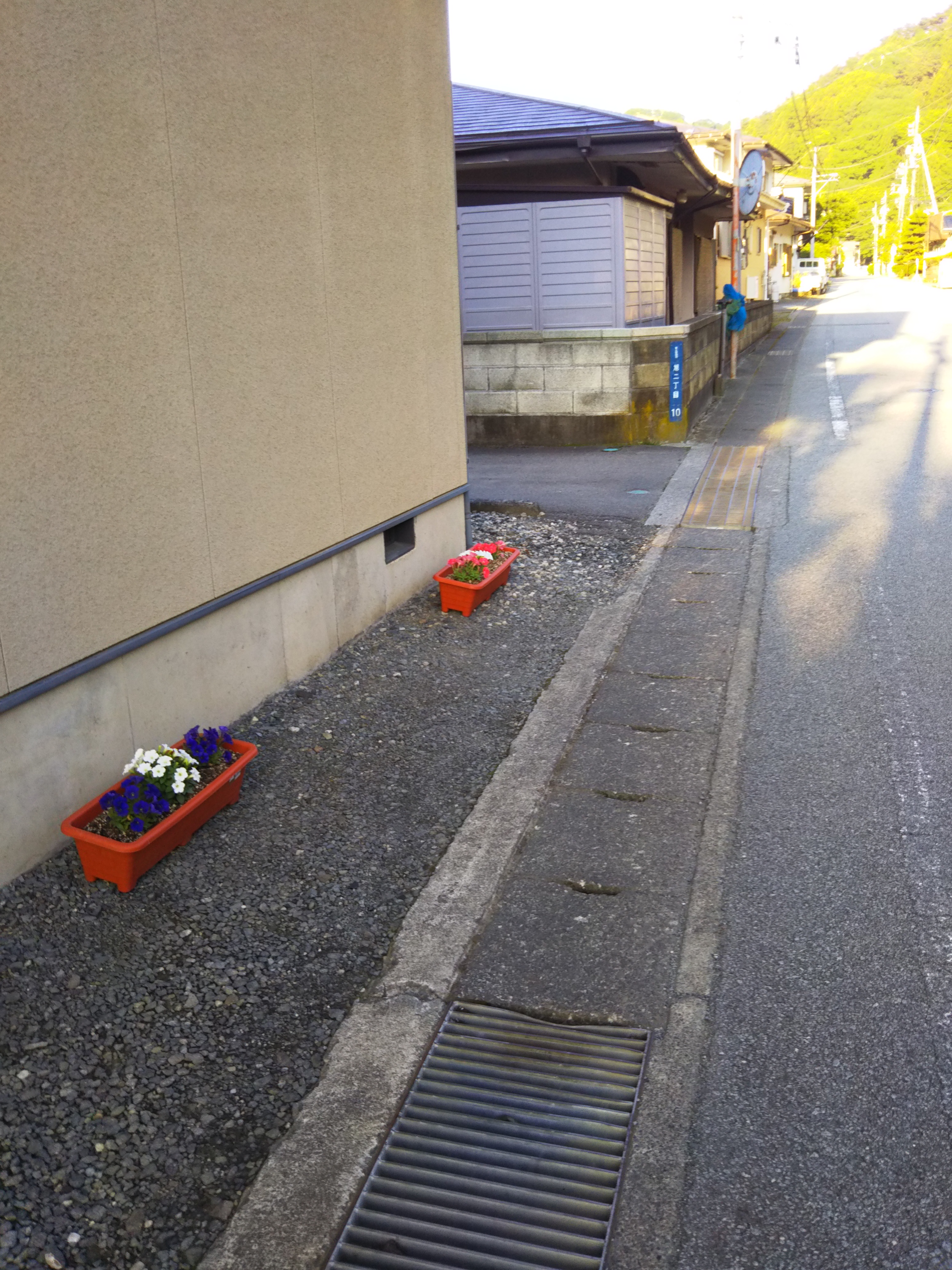 つるやうどん・旭会館の通りの両脇の家の前道路にプランターがおいてありました。
