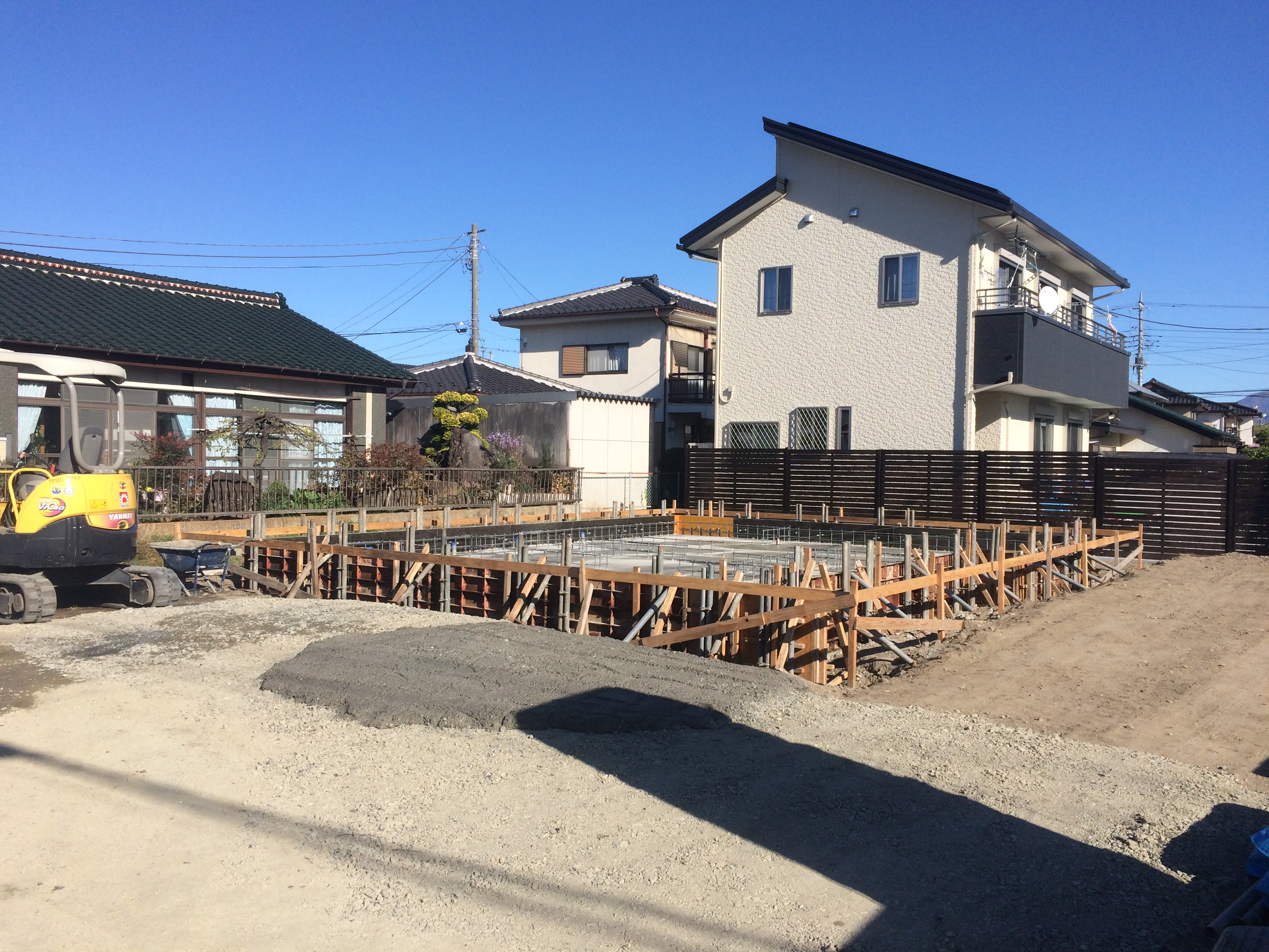 基礎のコンクリート打ちをし、この後は立ち上がり部分の型枠を組み、