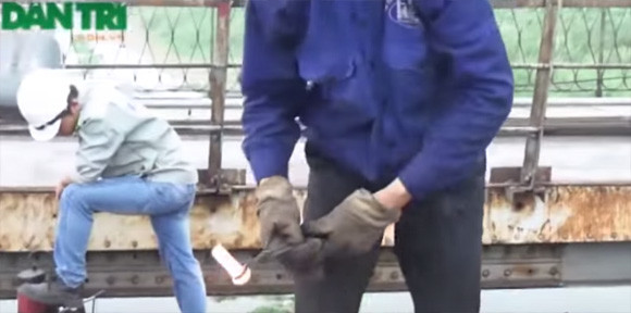 投げられたリベットを穴に差し込み、二人で打ち込むらしいです。当然冷める前に完了しないと