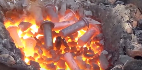 リベットと呼ばれる鋲をコークスで1000度まであぶり、あぶったものを下から上にいる