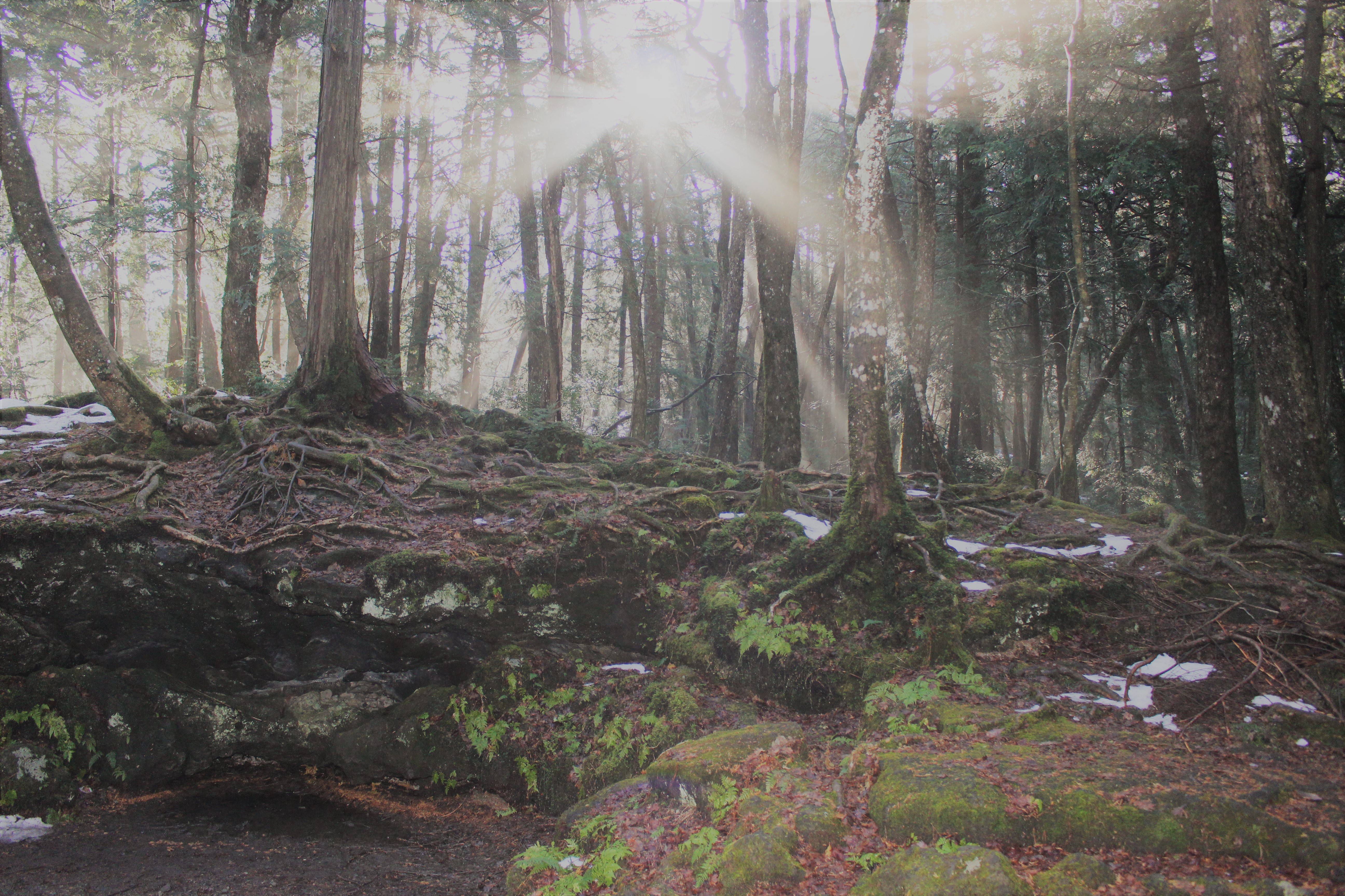 なので土が少なく根は下に行くことなく蛇や竜のように横へ横へと伸びています。土が少ないので大きくなると木はその体を支えきれず、倒れて土になり他の木々の養分となり成長させる。