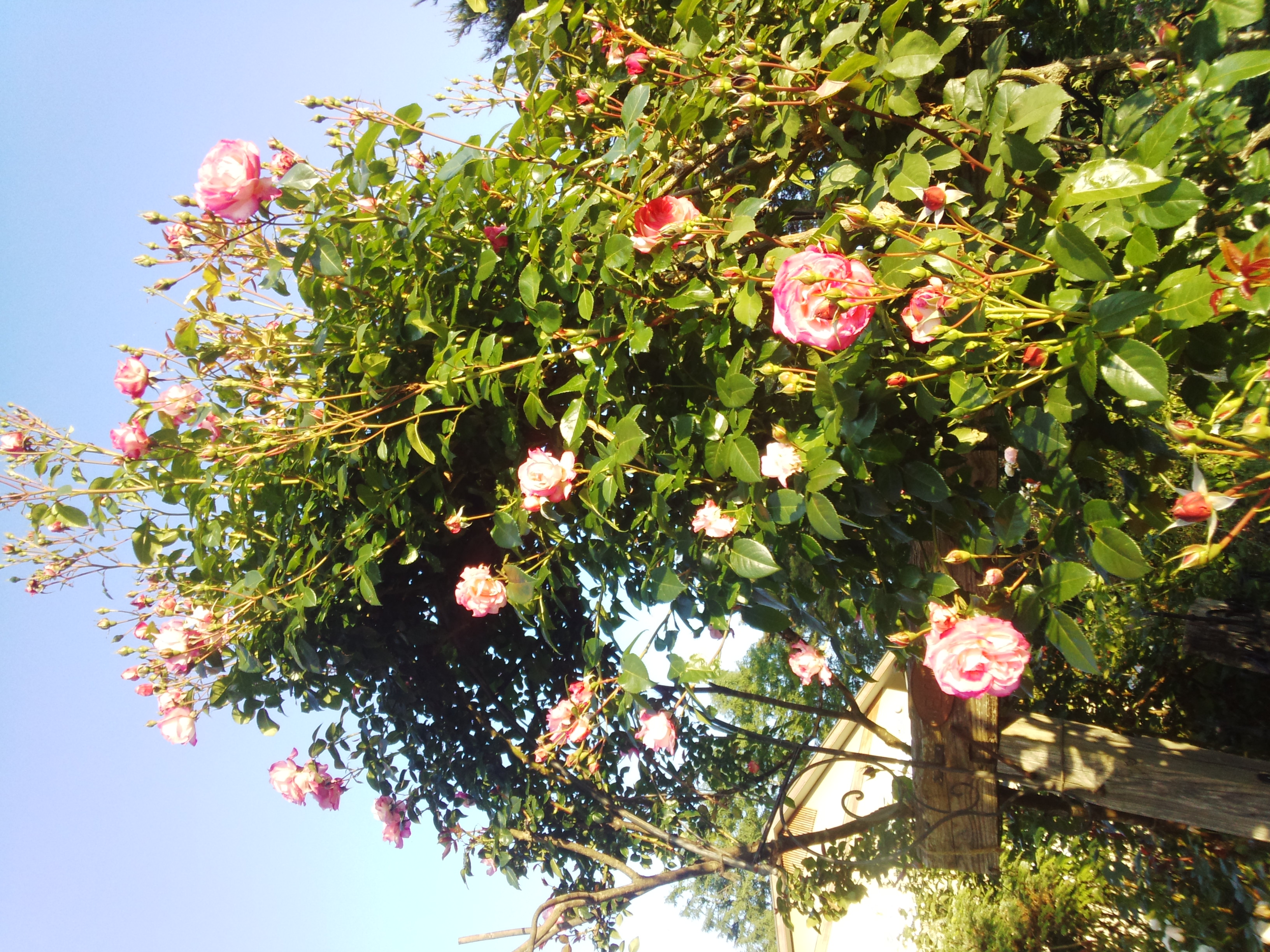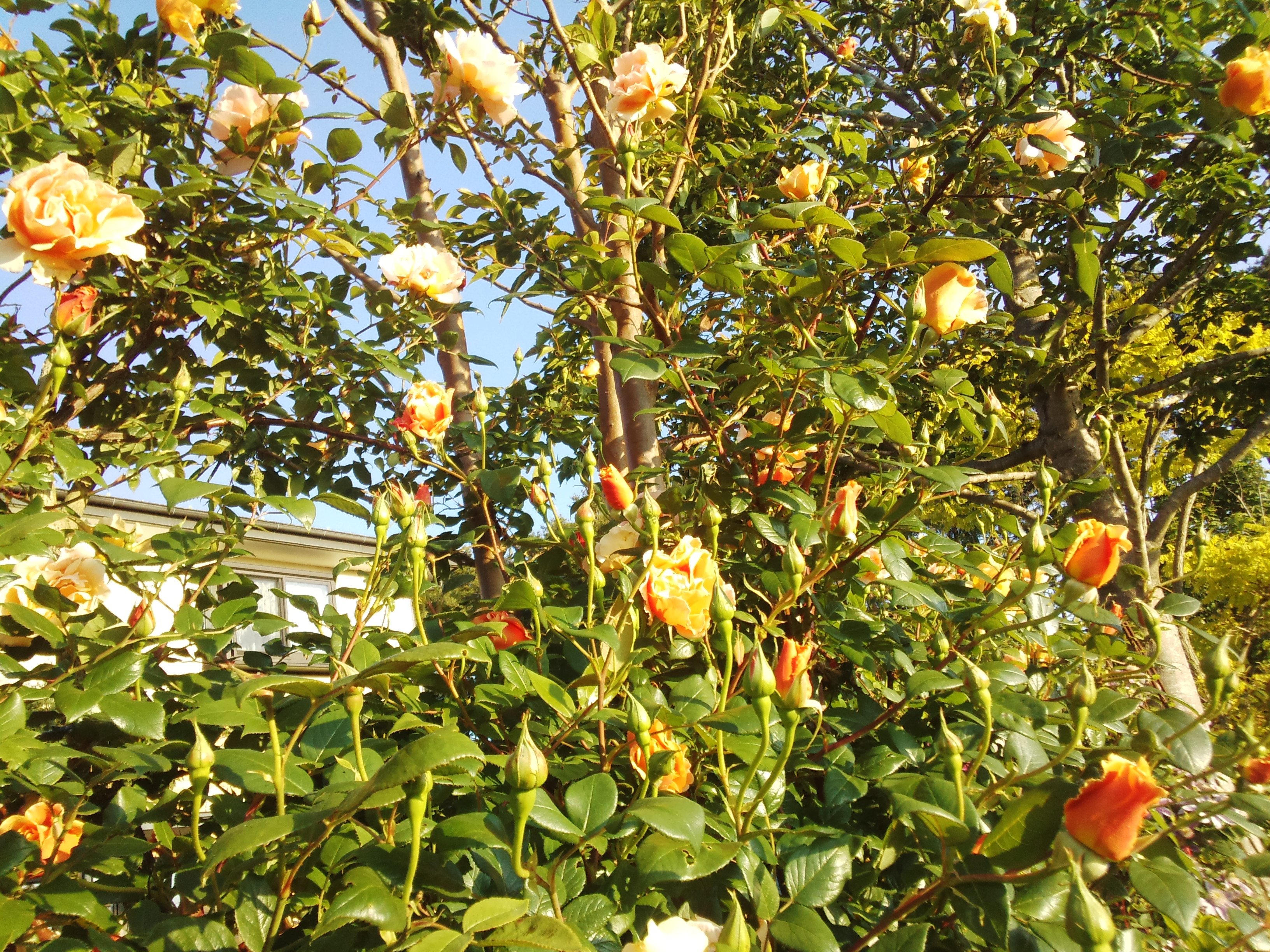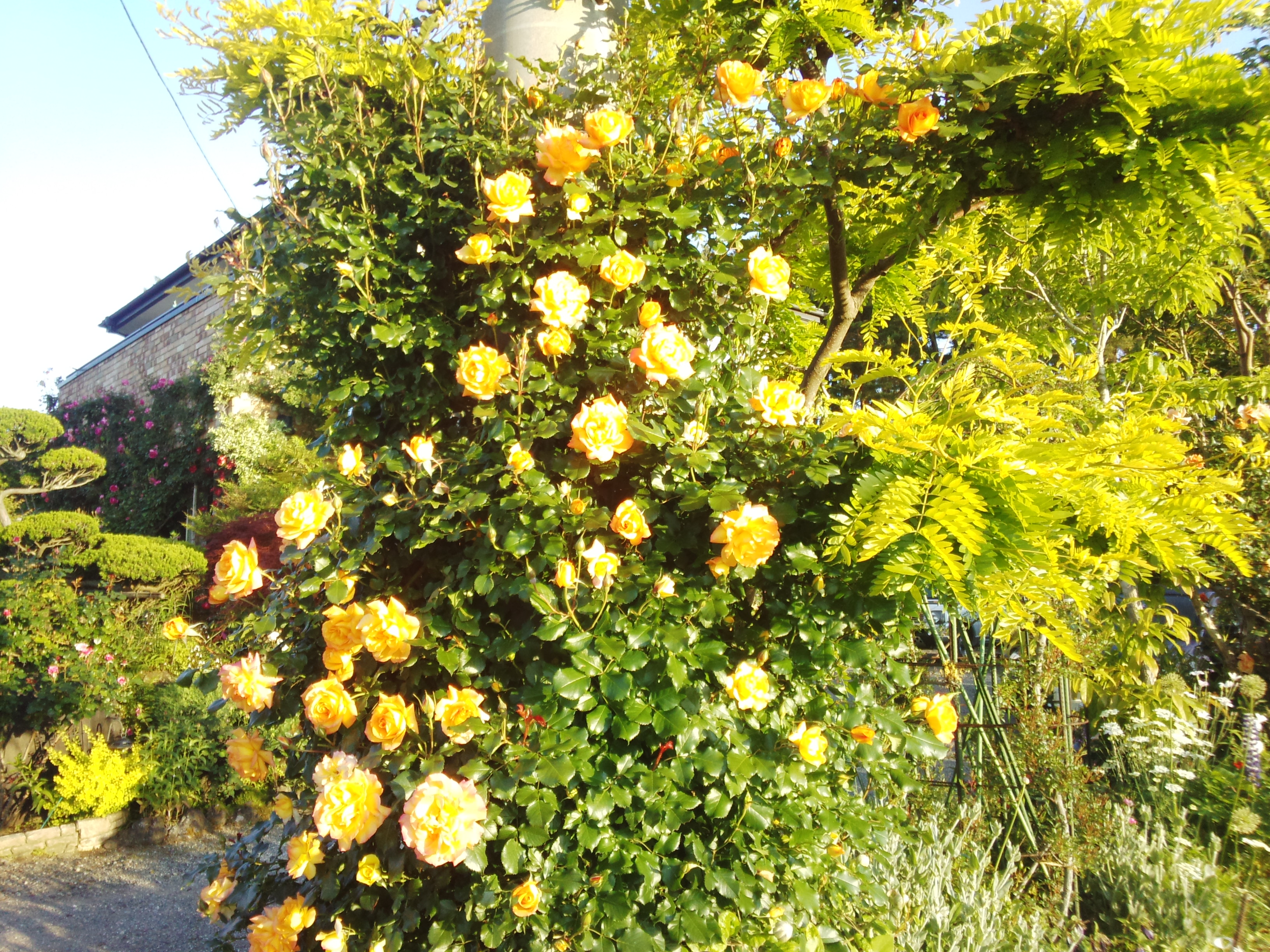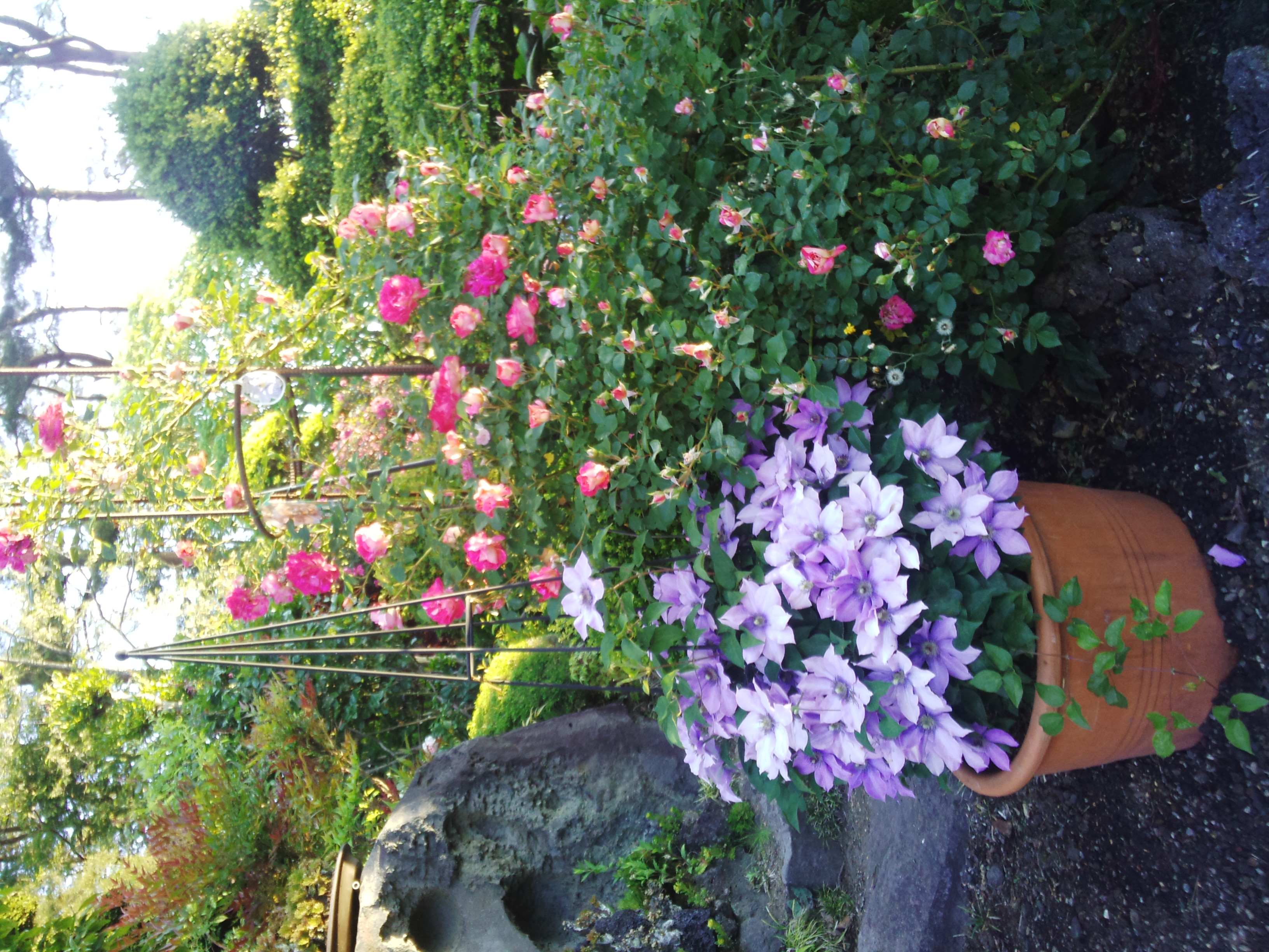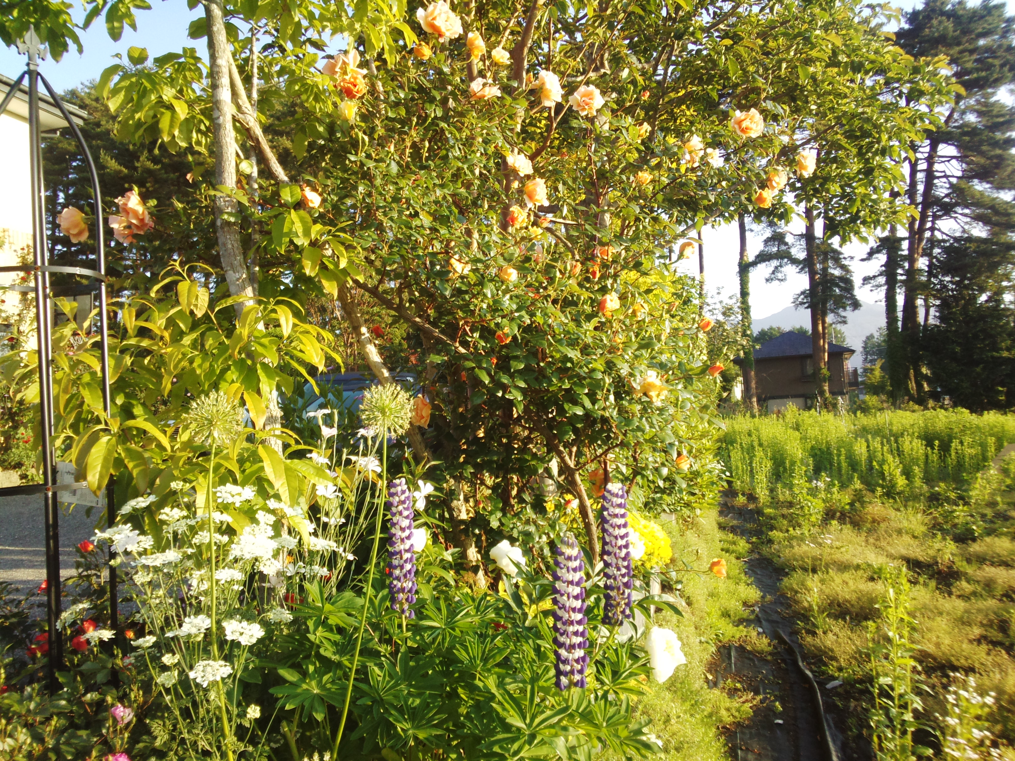 入り口の「サハラ98」「アロハ」「ロイヤルサンセット」(花形・色・香がお気に入り)中央部分では今年から仲間に加わった「春風」クレマチスの「ミゼットブルー」が素晴らしいシーンを造りだしています。
