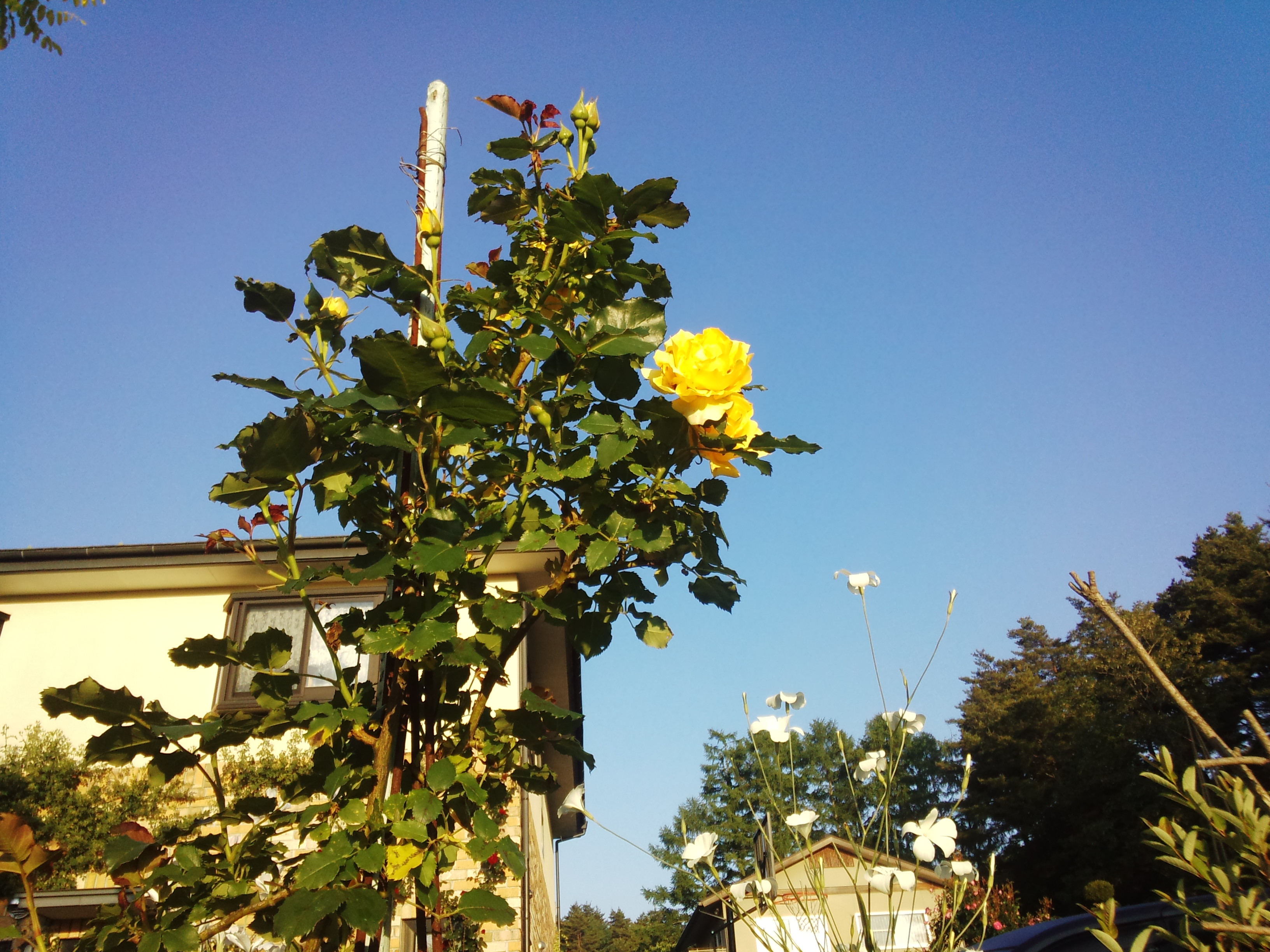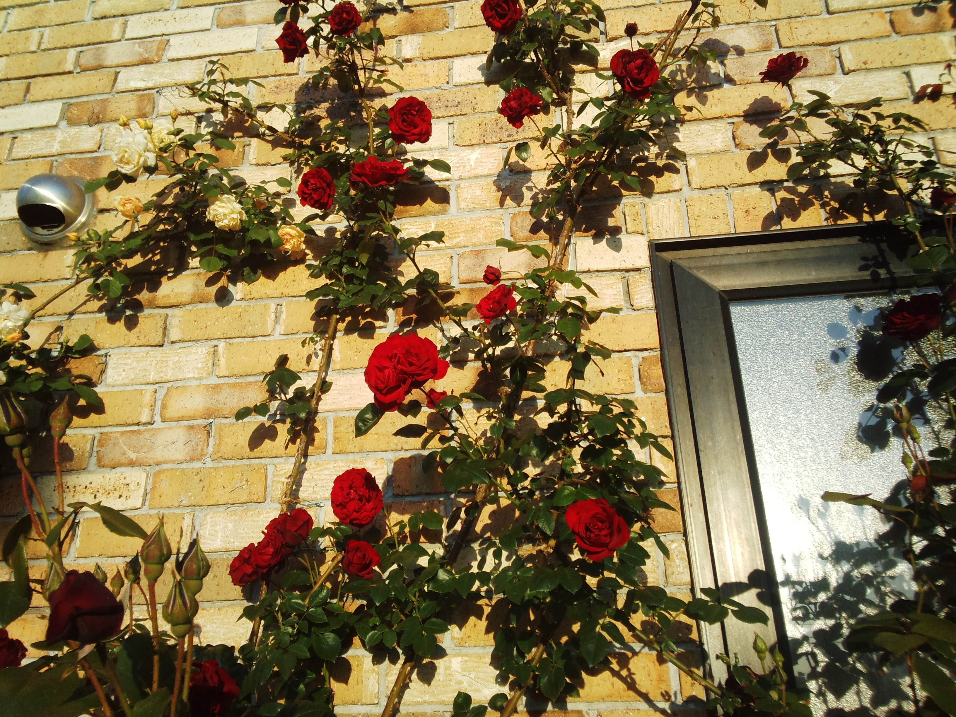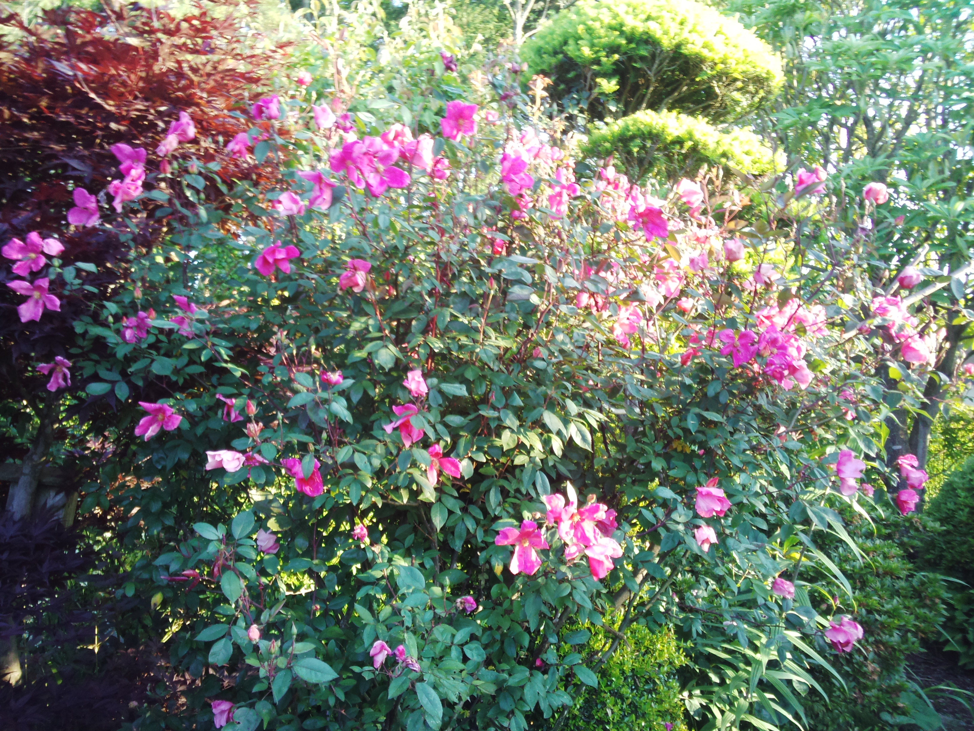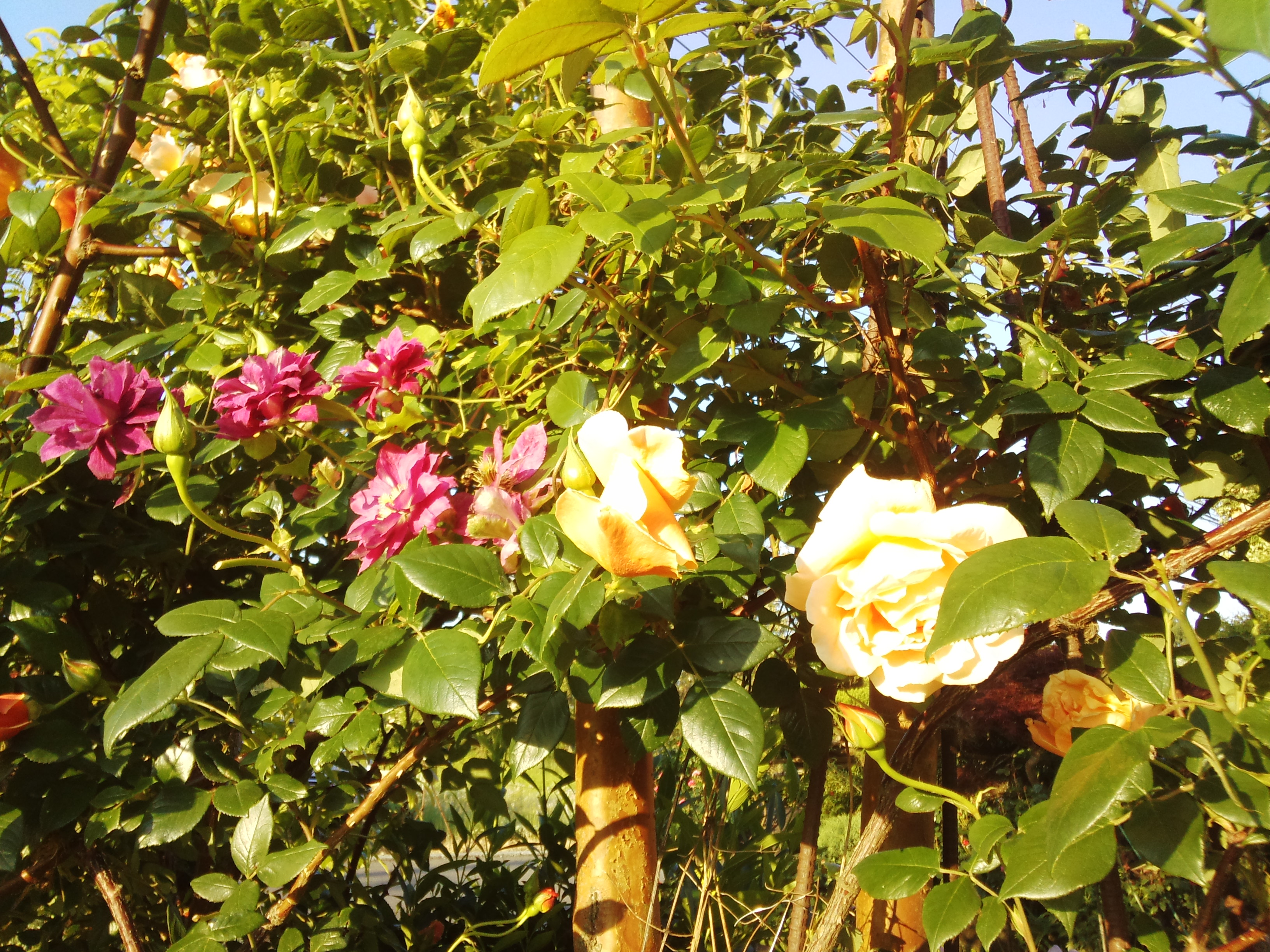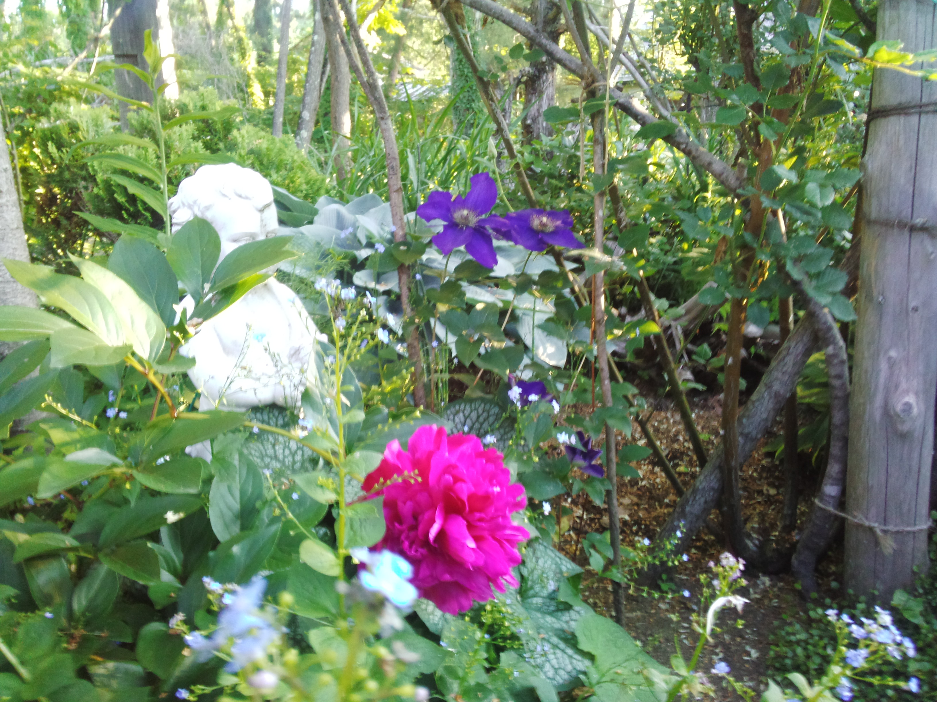 入り口の「サハラ98」「アロハ」「ロイヤルサンセット」(花形・色・香がお気に入り)中央部分では今年から仲間に加わった「春風」クレマチスの「ミゼットブルー」が素晴らしいシーンを造りだしています。