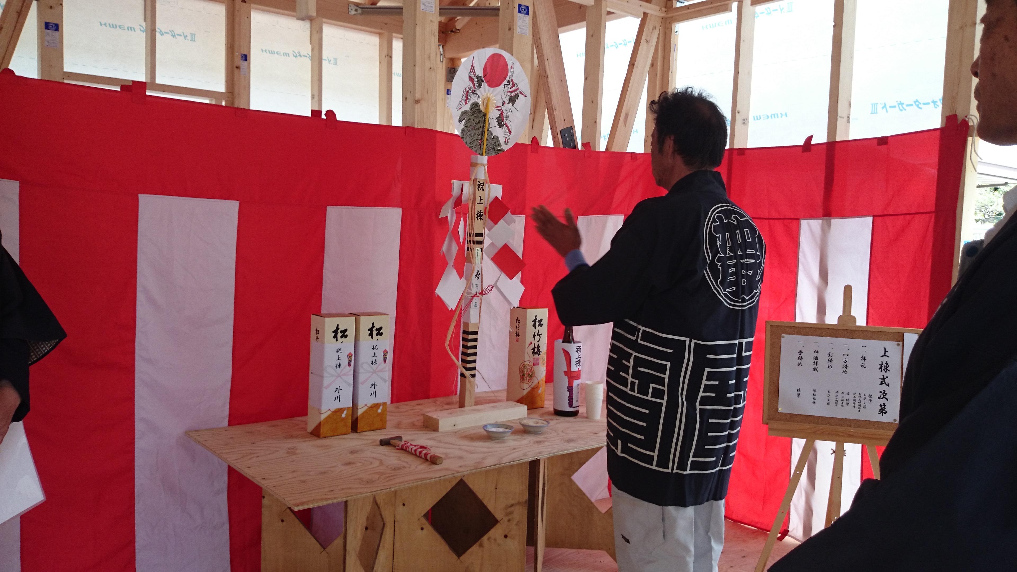新築の一大イベント「上棟式」を行いました。 上棟式とは、建物の守護神と匠の神を祀って、棟上げまで工事が 終了したことに感謝し、無事、建物が完成することを祈願する儀式です。 棟梁に無事、おさめてもらいました。 完成まで安全第一で、がんばってもらいます。