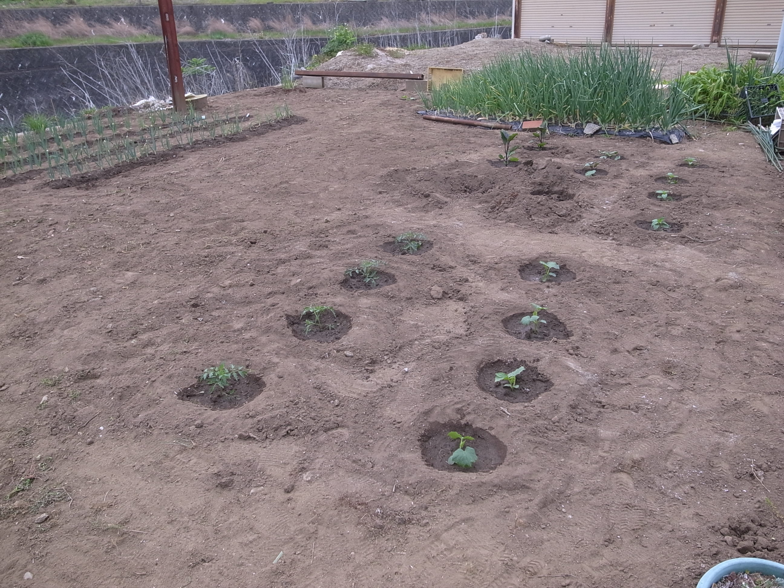 為ブロッコリーを取り、前週に耕して準備しておいた場所に、トマト、キュウリ、