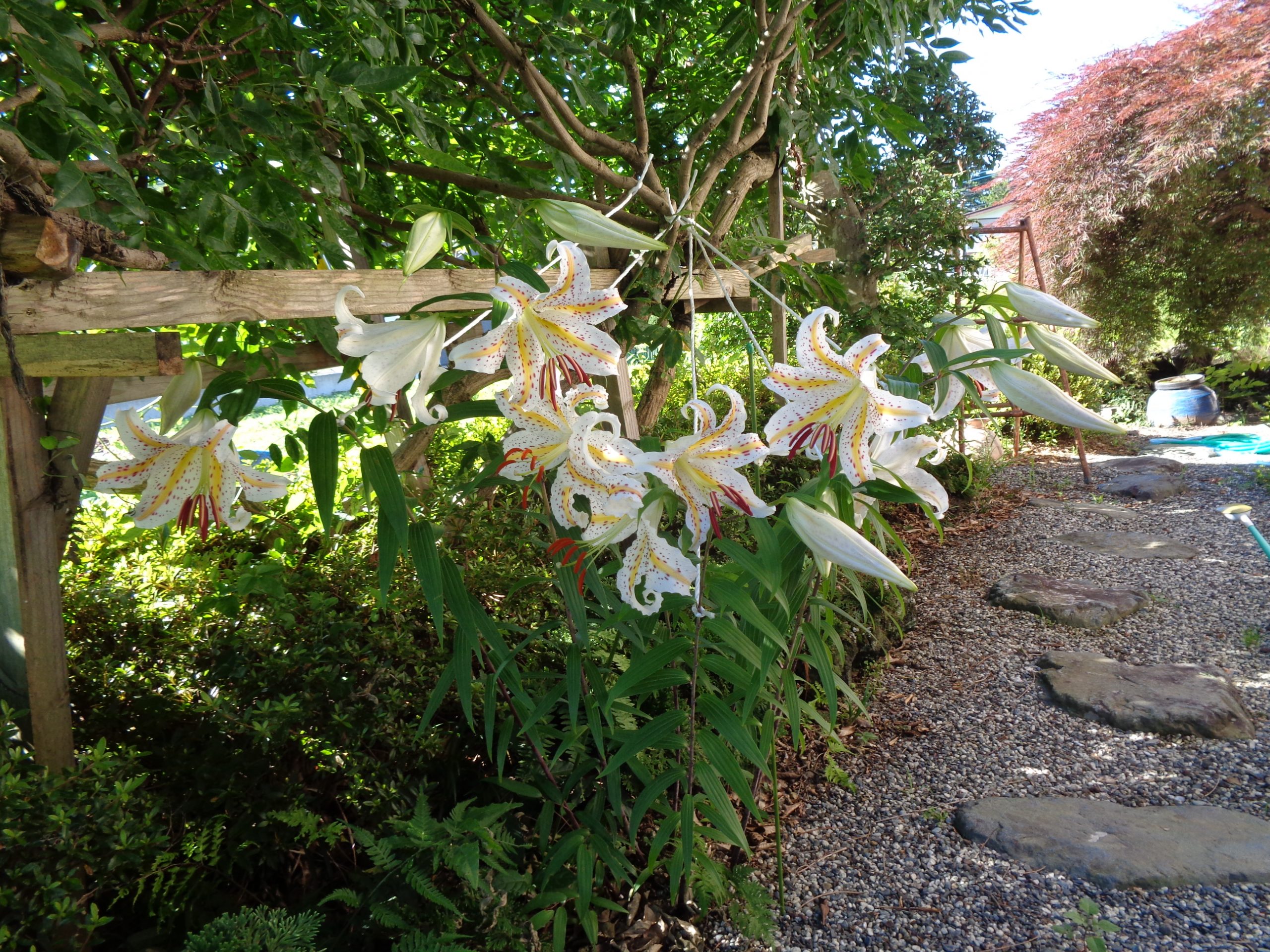 入梅明けと同時に我が家のヤマユリが開花し始めました、草丈は例年より低く約1.0m 花径は例年と同じ18~20㎝です、花は花弁が外に弧を描きながら広がっています、花の重みで茎全体が傾き、今年も隣のフジの枝で支えています。
