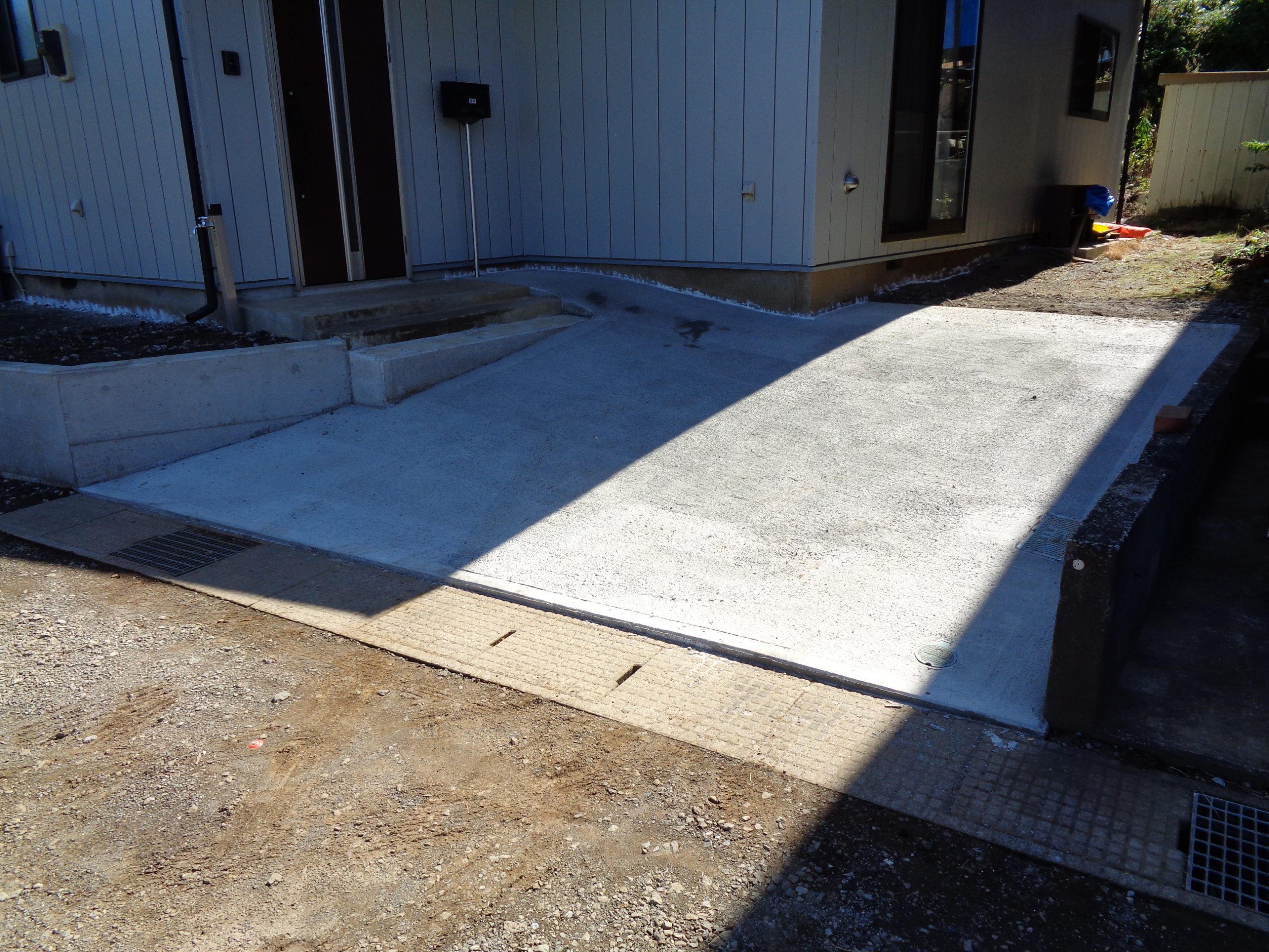 アプローチとスロープのコンクリート打設が終わり、養生期間も終わりました、止め枠や仮設養生通路の撤去を行い、埋め戻しを砕石で行い完了です、コンクリート仕上げを竹ぼうきで粗目仕上げで仕上げたので、滑り止めが最高に仕上がりました、Y様もこれだと多少の積雪でも滑らないと思う とても喜んでいました、これで擁壁、アプローチとスロープの完了です。
