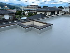 屋上のシート防水改修工事の続きです。張り込んだシート防水層平面の後立上がり部分の張込みを行い、