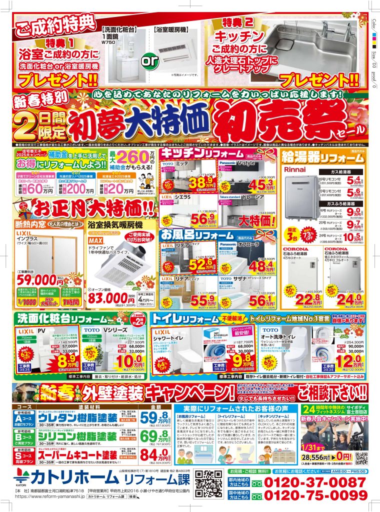新春リフォーム相談会開催!【イオン石和店&Qスタ富士吉田店にて同時開催】 豪華来場記念品あり!(ダスキンのお掃除セット) バスルームorキッチン見積もりでお米をプレゼント♪ なんと浴室、キッチンご成約の方にも超豪華特典が! 浴室ご成約の方…洗面化粧台or浴室暖房機をプレゼント! キッチンご成約の方…人造大理石トップにグレードアップ! リフォームのプロに相談できる二日間。